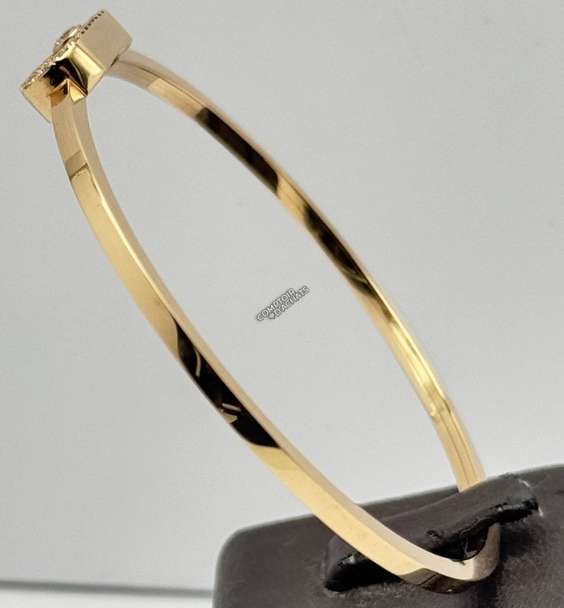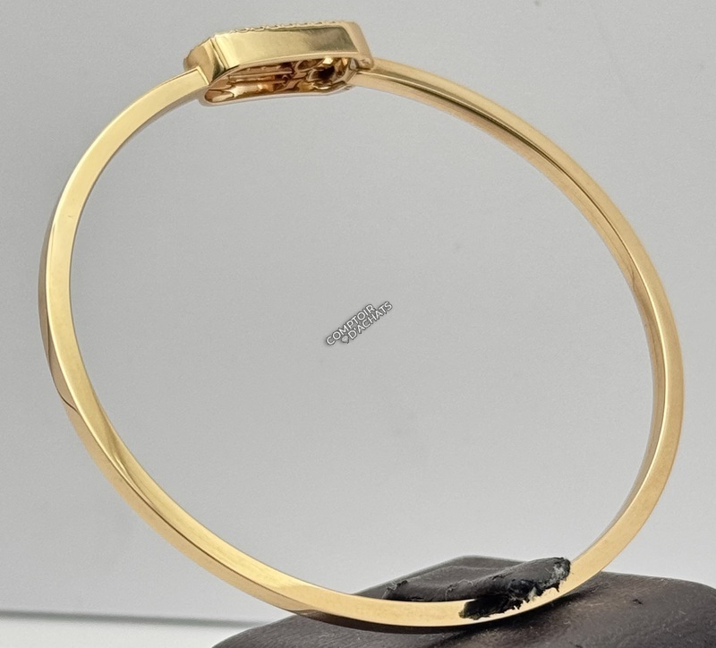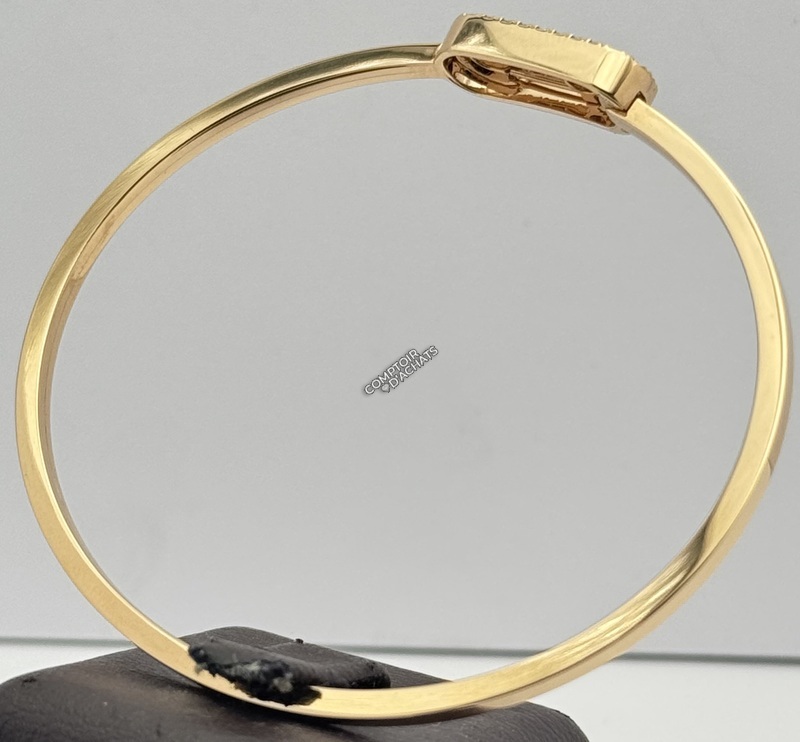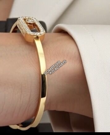 Il est réalisé en or rose et met en valeur un motif rectangulaire caractéristique Move Uno. L'élément central est un diamant mobile (un total de 0,34 carat pour l'ensemble du bijou, qualité G/VS) qui se déplace avec les mouvements du poignet, créant un éclat subtil et contemporain.
