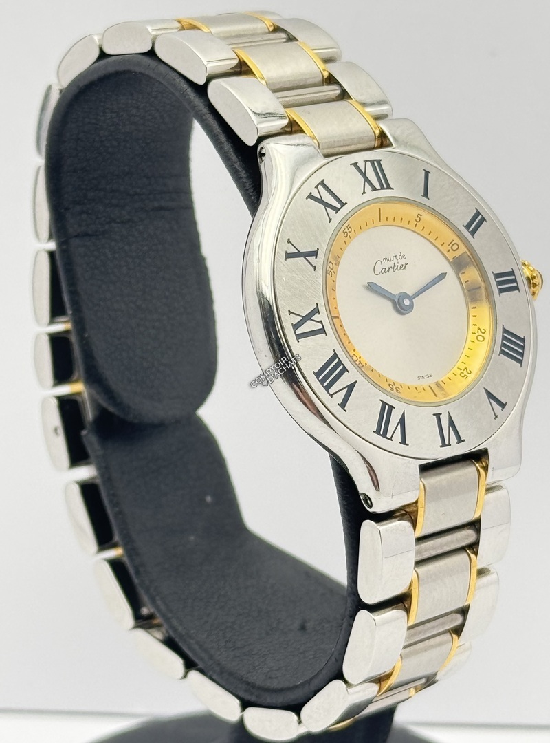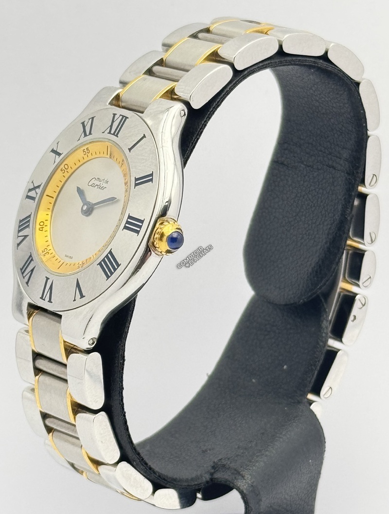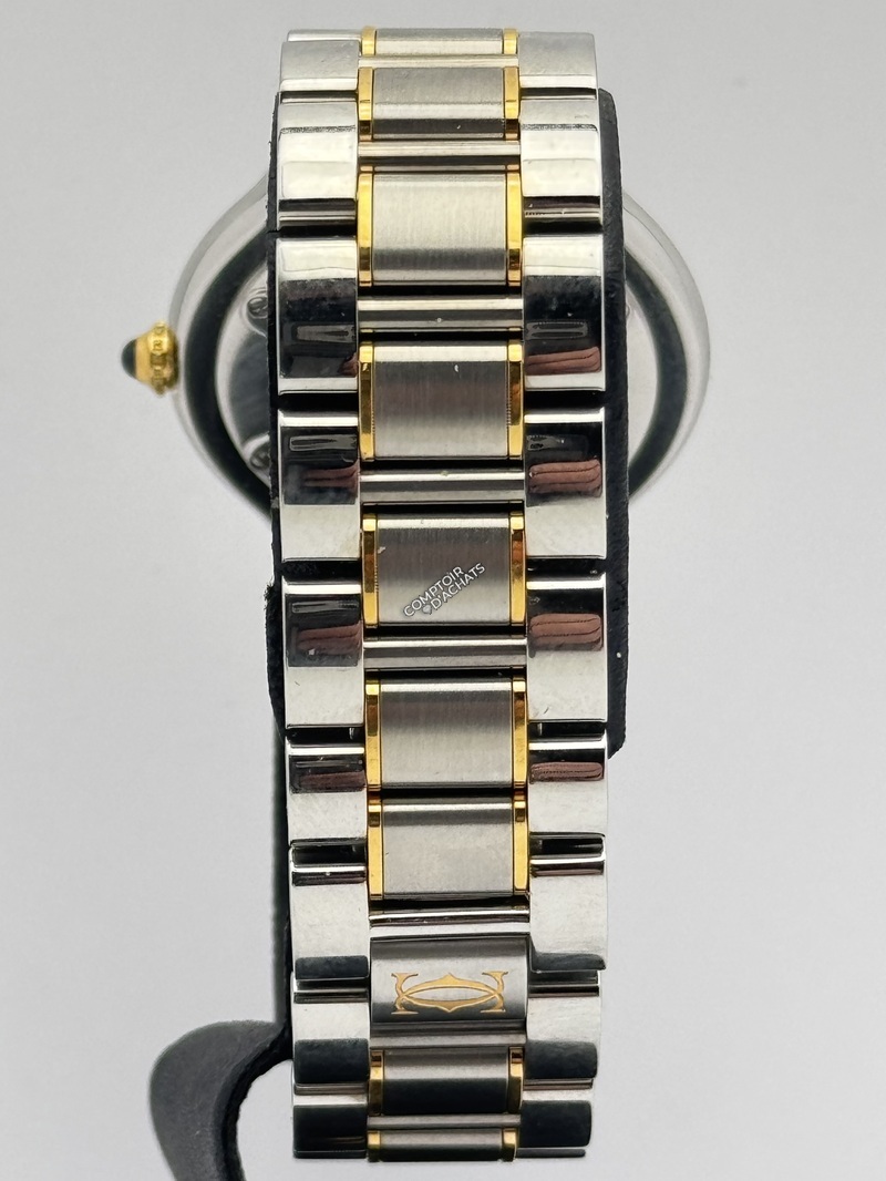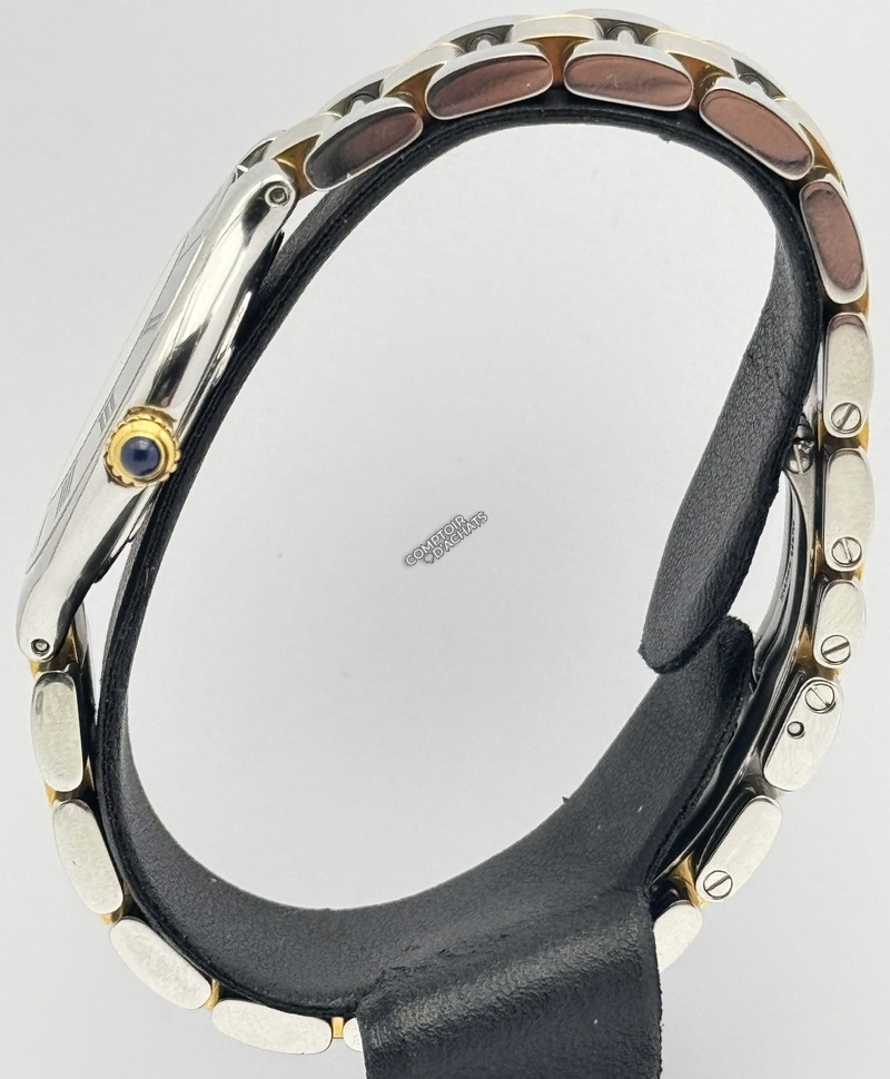 Son identité se remarque par les chiffres romains gravés sur la lunette, qui jouent avec la lumière, ainsi que par son cadran argenté,té épuré marqué "Must de Cartier". Le bracelet renforce l'harmonie du design, tout en offrant une grande souplesse et un porté confortable.