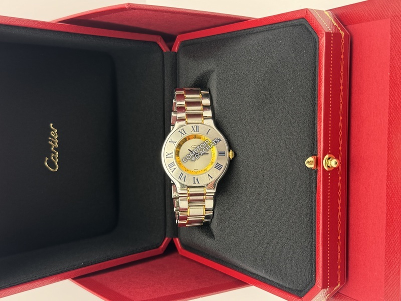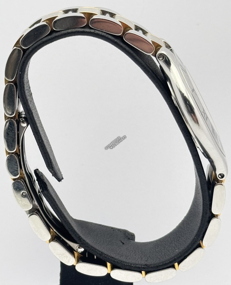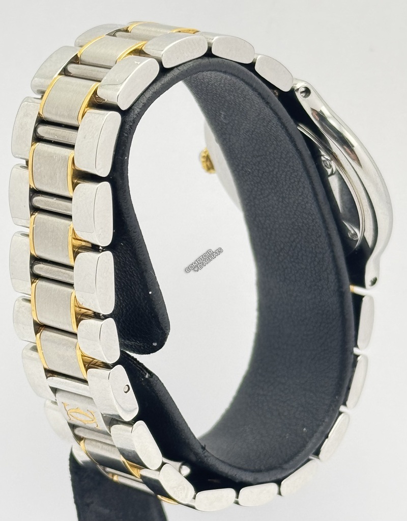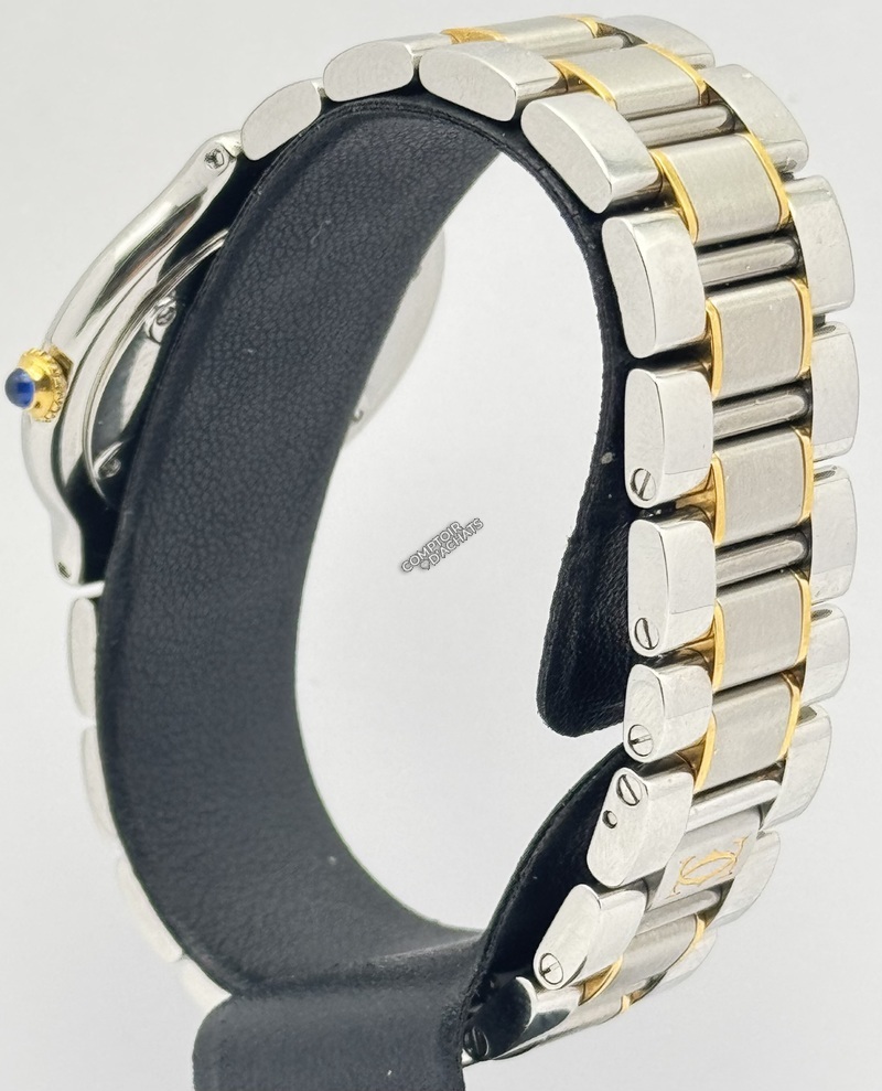 Son identité se remarque par les chiffres romains gravés sur la lunette, qui jouent avec la lumière, ainsi que par son cadran argenté,té épuré marqué "Must de Cartier". Le bracelet renforce l'harmonie du design, tout en offrant une grande souplesse et un porté confortable.