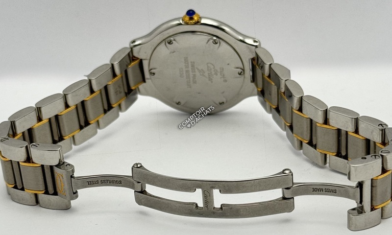 Esthétique Cartier : Elle respecte les codes classiques de la Maison, notamment le cabochon de saphir bleu sur la couronne et les aiguilles en acier bleui.