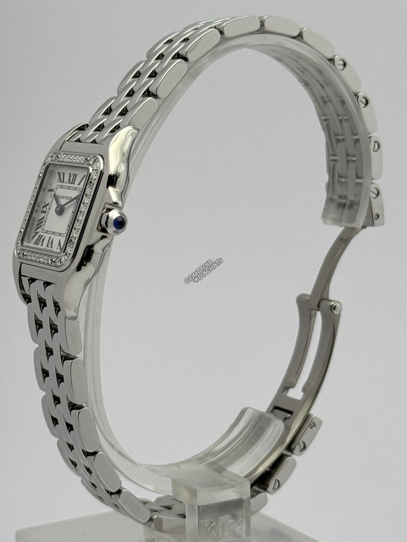 Montre Panthère de Cartier, petit modèle, mouvement à quartz. Boîte en acier, lunette sertie de 36 diamants taille brillant pour un total 0,24 carat. Dimensions : 23 mm x 30 mm, épaisseur : 6 mm, couronne ornée d'un spinelle de synthèse bleu, cadran argenté, aiguilles en forme de glaive en acier bleui, bracelet en acier. Étanche à 3 bar (~30 mètres).
