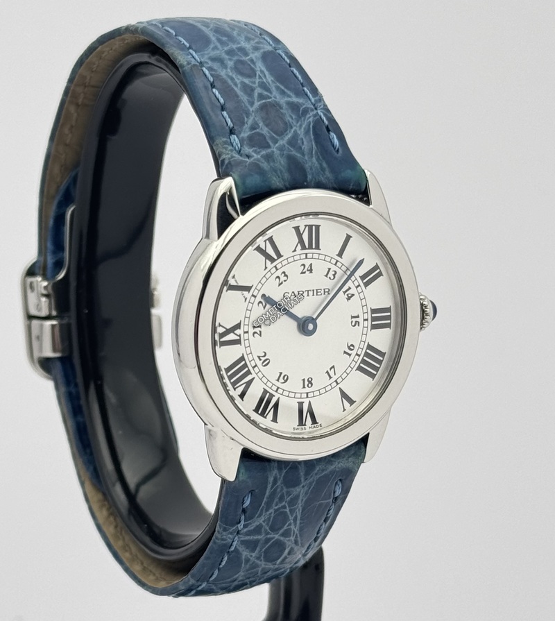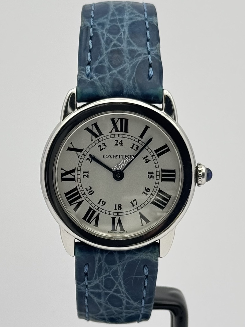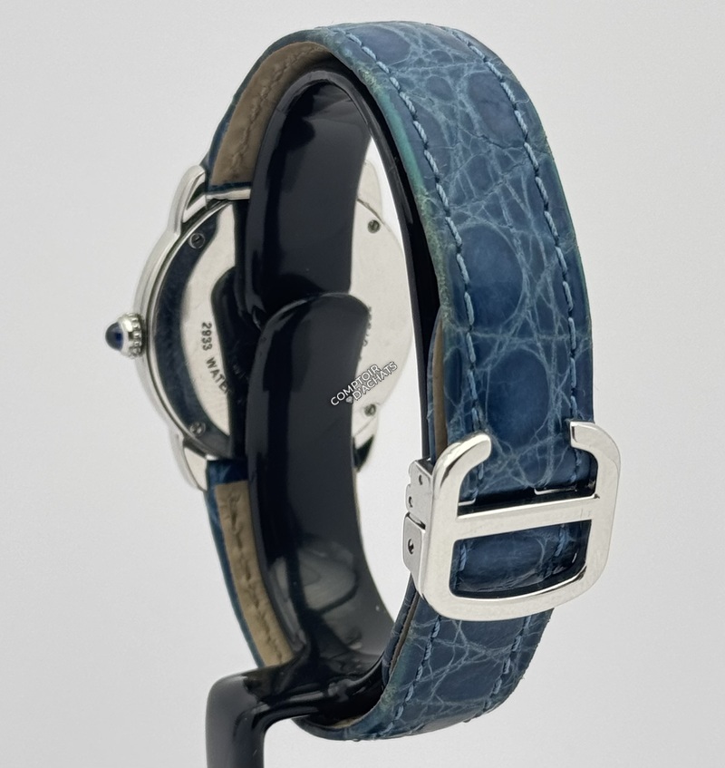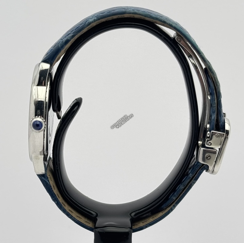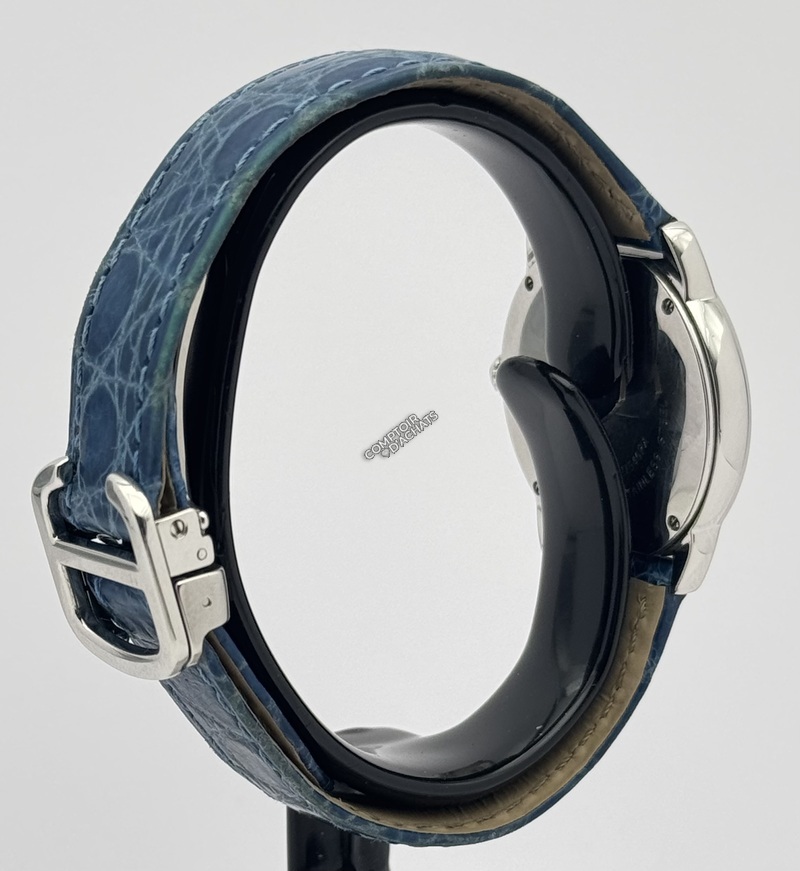 Bracelet : La montre est montée sur un bracelet en cuir bleu (alligator/crocodile) d'origine, fixé par une boucle déployante siglée Cartier.
