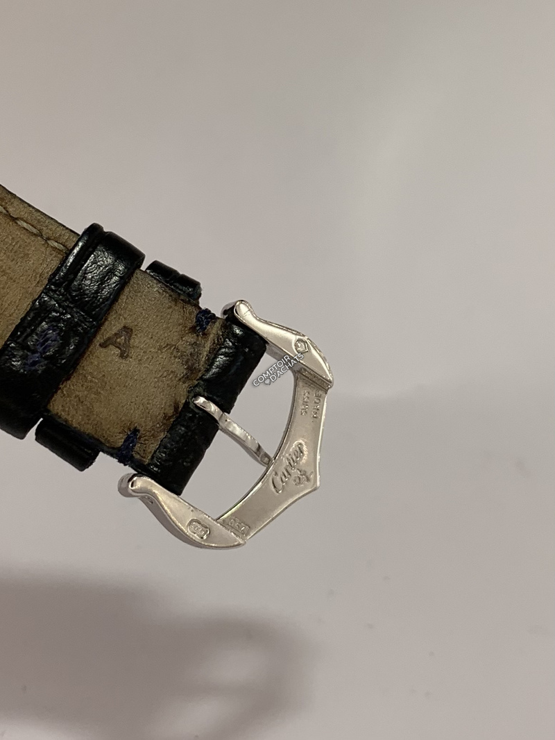 Cet exemple est livré avec un mouvement à quartz, logé dans un boîtier en or blanc 18 carats. La boucle d'origine en or blanc 18 carats est également toujours présente et montée sur un bracelet Croco d'origine Cartier bleu nuit.