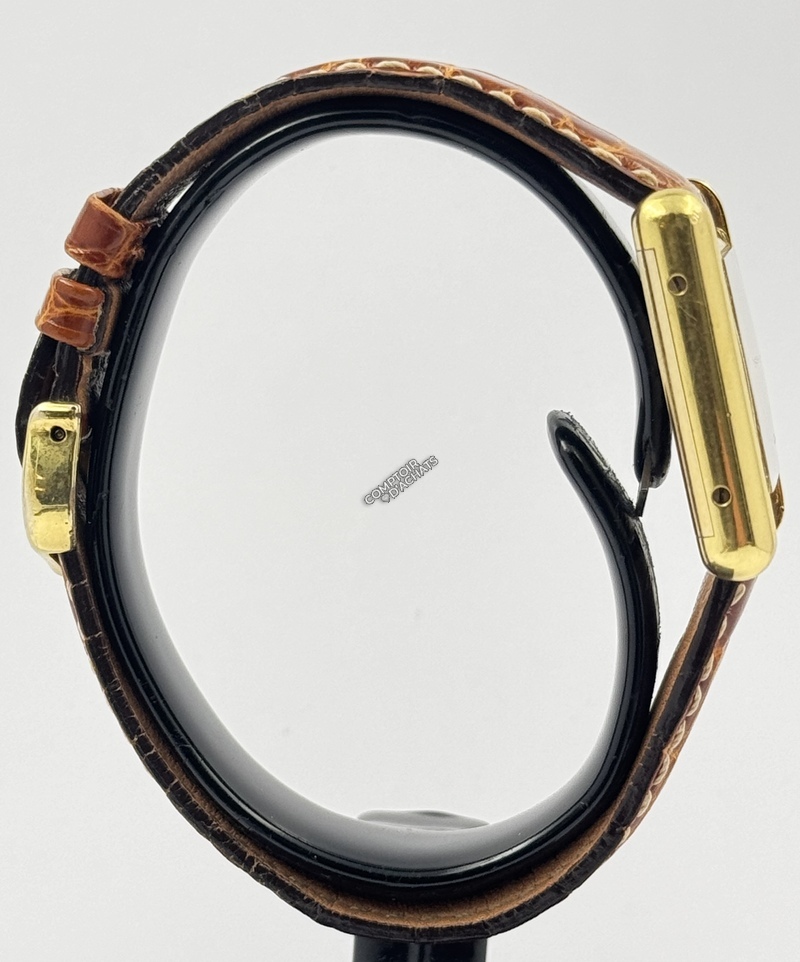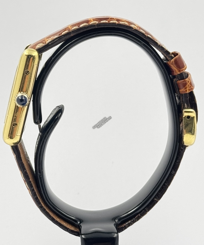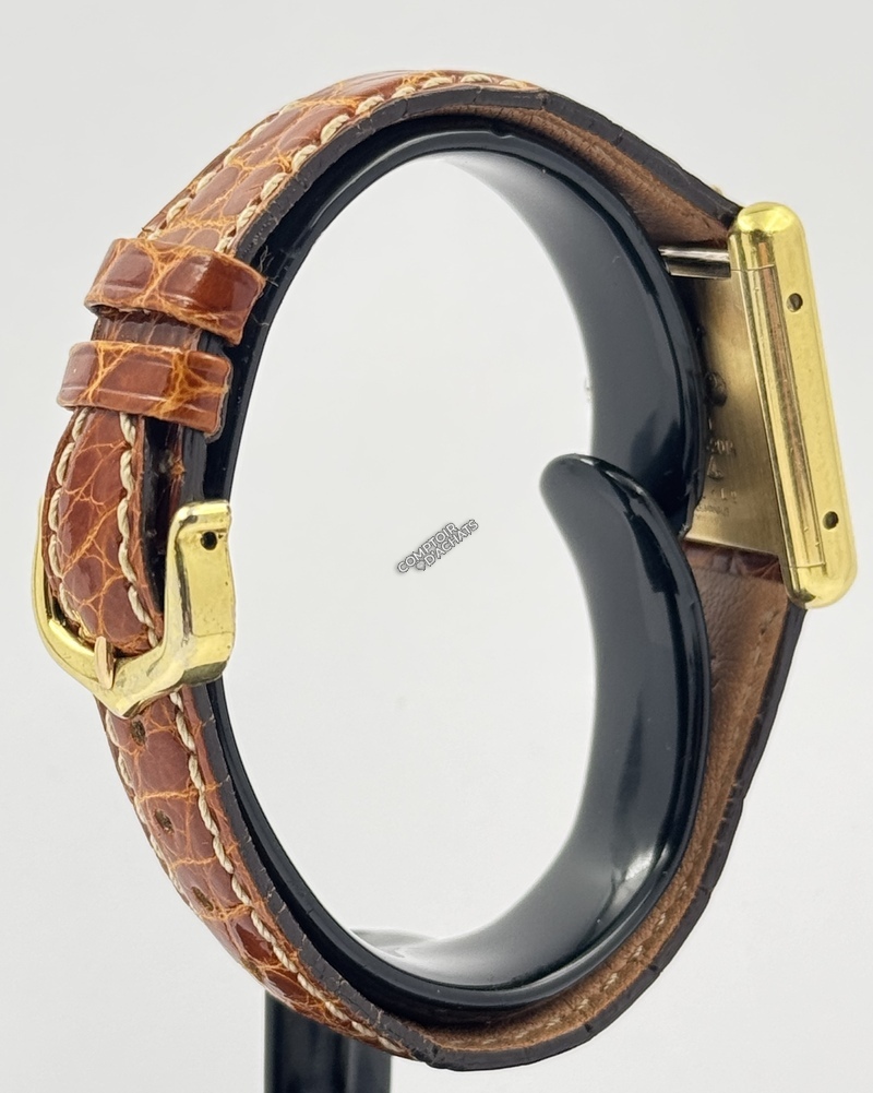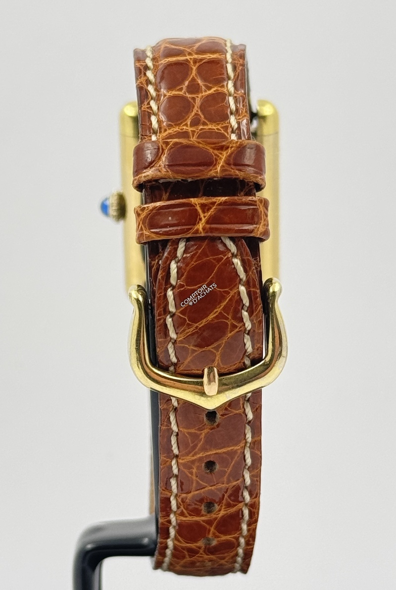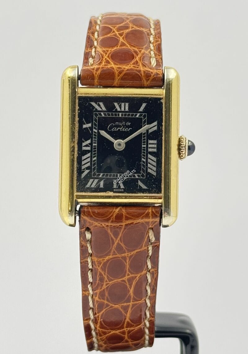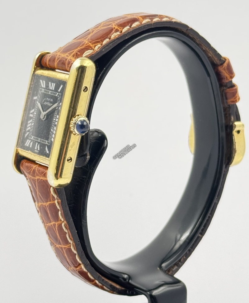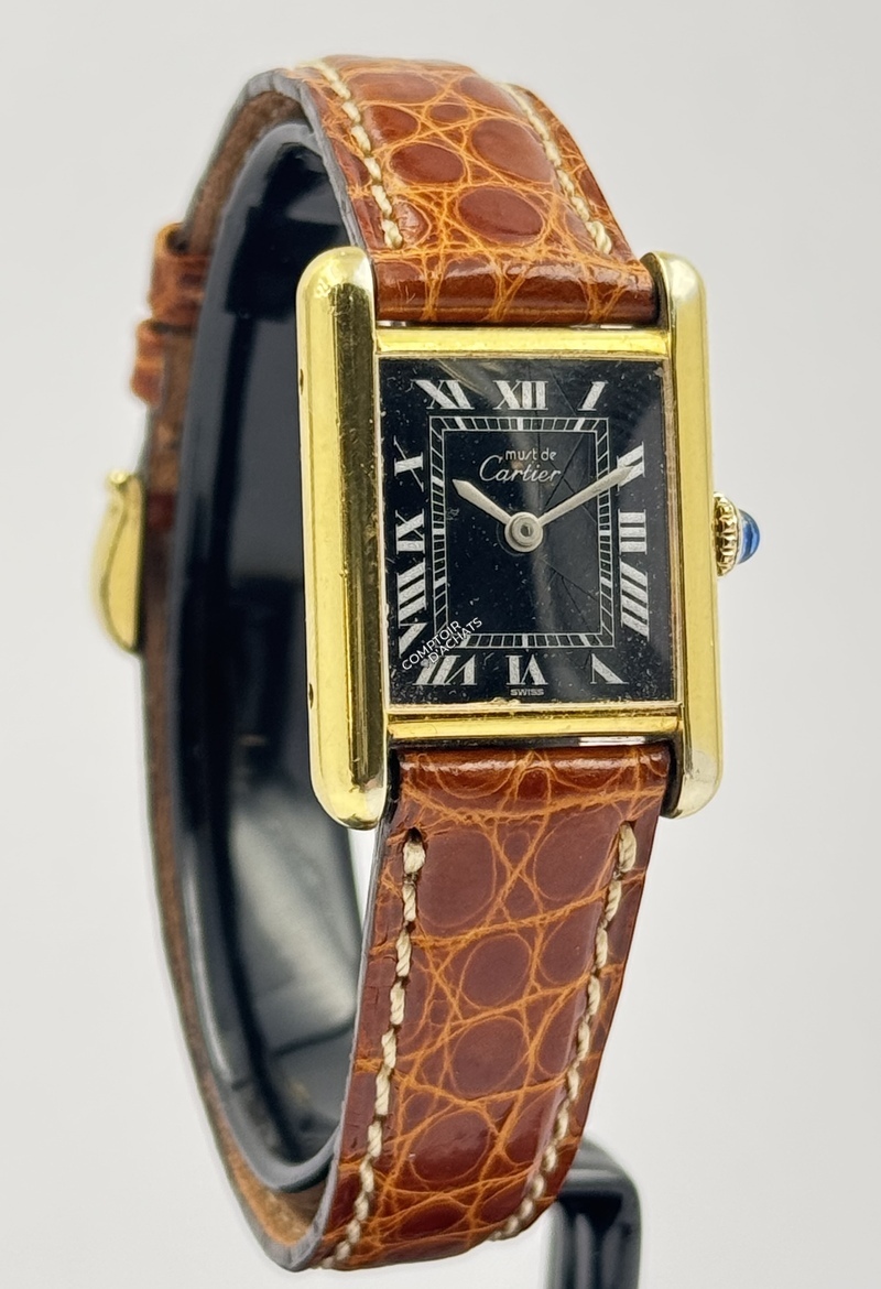 Cette pièce incarne l'élégance intemporelle de la maison Cartier. Ce modèle Must de Cartier se distingue par son allure sophistiquée et son cadran rare, offrant un contraste saisissant entre le doré du boîtier et la profondeur du noir.