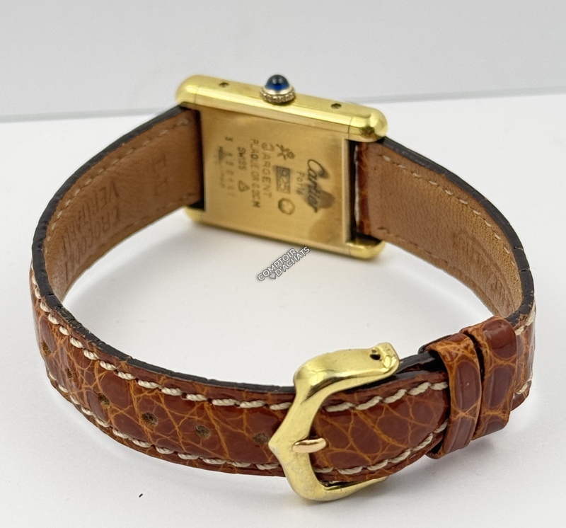 Bracelet : Cuir façon crocodile marron avec surpiqûres contrastées, complétant parfaitement les tons chauds du vermeil.