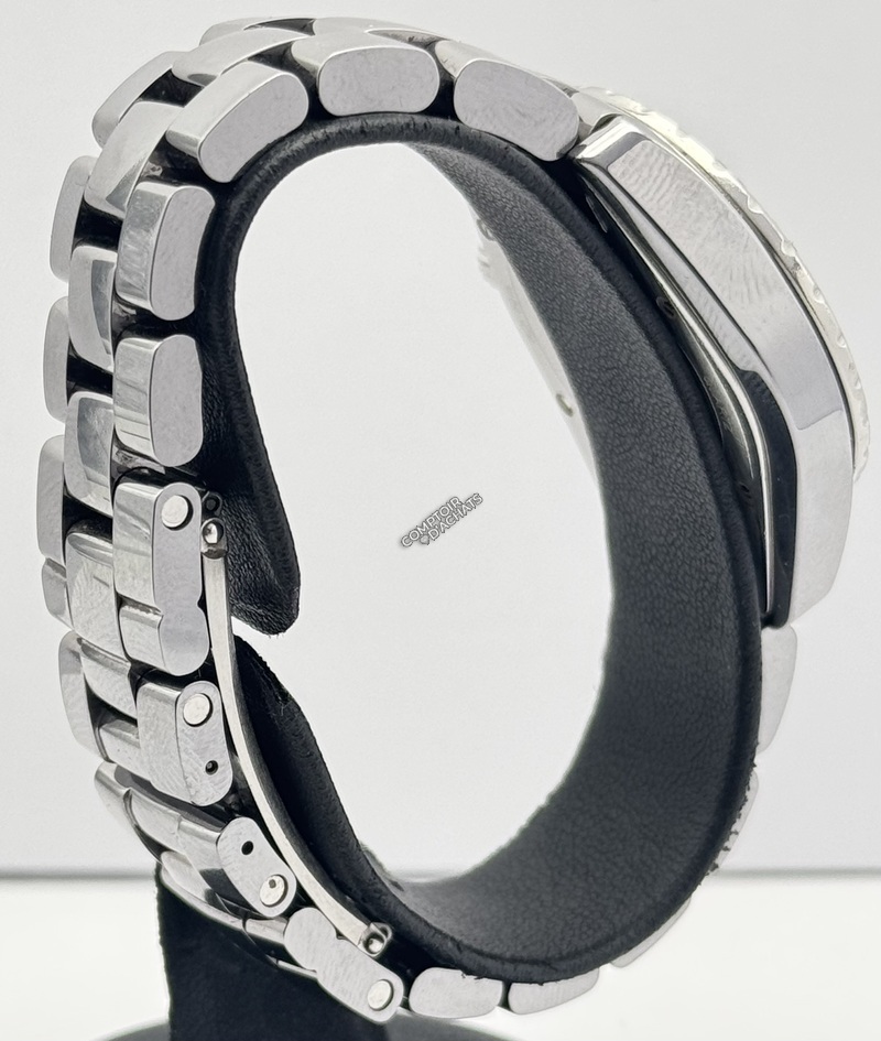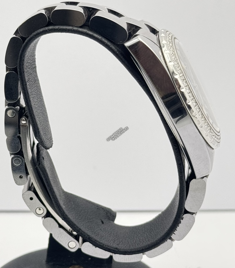 Sertissage Diamants : Ce modèle est une version précieuse. Sa lunette en acier est entièrement sertie de 53 diamants blancs qui captent la lumière. Le cadran gris est également rehaussé par huit index en diamants.