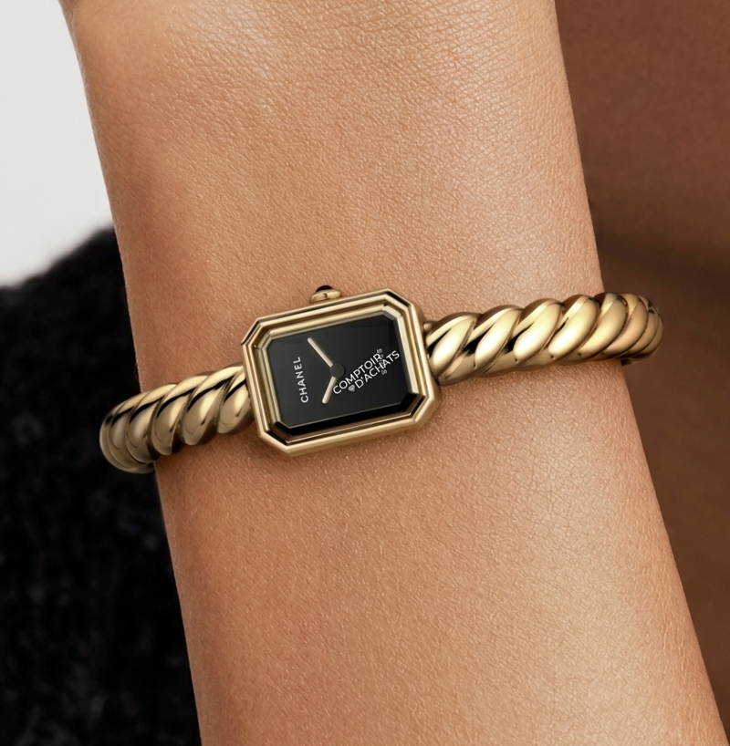 La Première Galon tout Or jaune n'est pas qu'une montre, c'est un hommage aux ateliers de la rue Cambon. Son nom fait référence au galon, ce ruban de tissu ou de passementerie qui borde les célèbres vestes en tweed de Chanel. Ici, le galon est réinterprété en or.