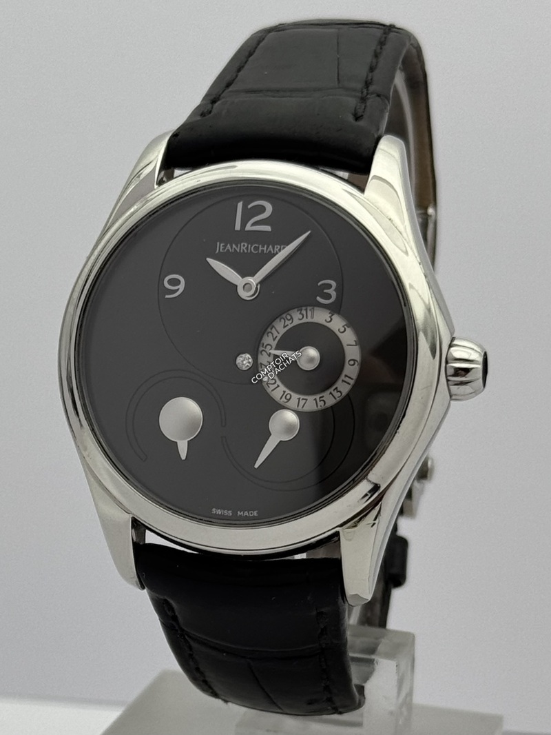 Elle présente un boîtier en acier inoxydable de 38 mm de diamètre et 10,75 mm d'épaisseur. Les fonctions incluent une petite seconde à 7 heures, une indication de la réserve de marche de 48 heures et une date à 3 heures.