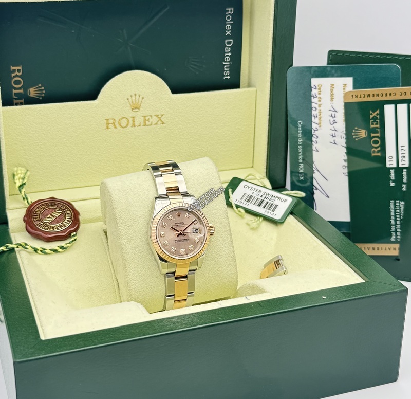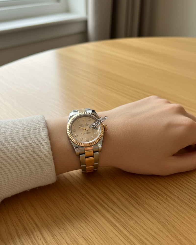 Élégante et intemporelle, cette Rolex Datejust 26 mm, référence 179171, associe acier inoxydable et or rose 18 caratspour une allure raffinée. Elle est montée sur un bracelet Oyster bicolore avec boucle déployante, et dotée d’une lunette cannelée en or rose.