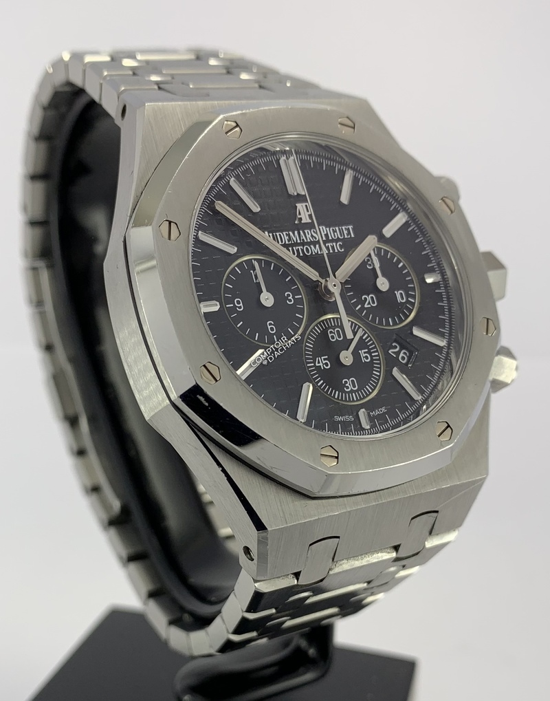 Cadran noir avec motif « Grande Tapisserie », index appliques et aiguilles Royal Oak en or gris avec dépôt luminescent