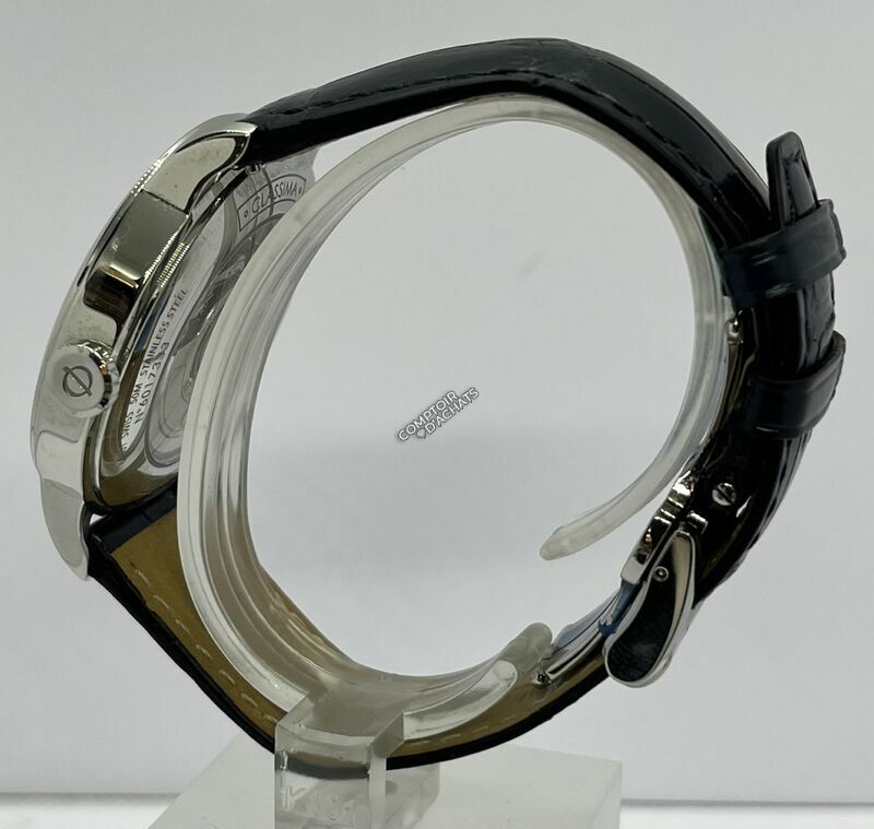 Le cadran blanc affiche des chiffres romains en acier, au décor guilloché ligne et un guichet de date à 3 heures. Les aiguilles bleues des heures, des minutes et des secondes sont couplées avec une seconde aiguille des heures à l'extrémité bleue et une échelle de 24 heures sur le bord du cadran. Un bracelet en cuir d'alligator bleu accompagne la modernité de la Classima 10272.