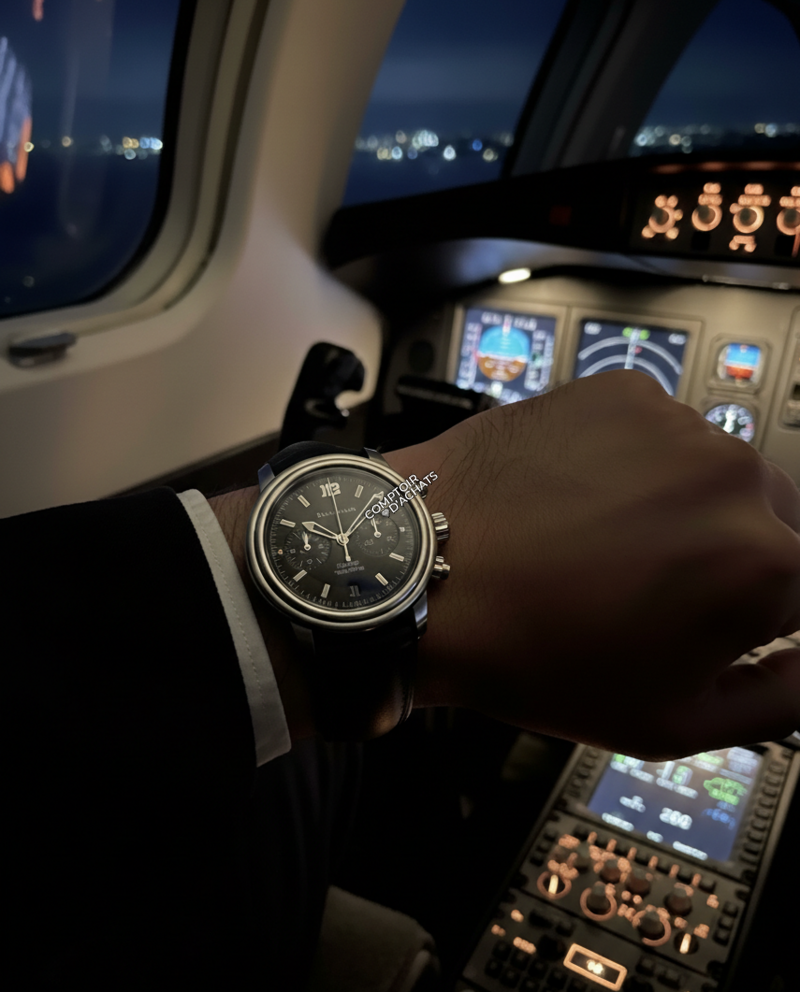 La configuration à deux compteurs (petite seconde et minutes) allège visuellement l’ensemble, tandis que la date à 6 h apporte confort de lecture et sophistication.