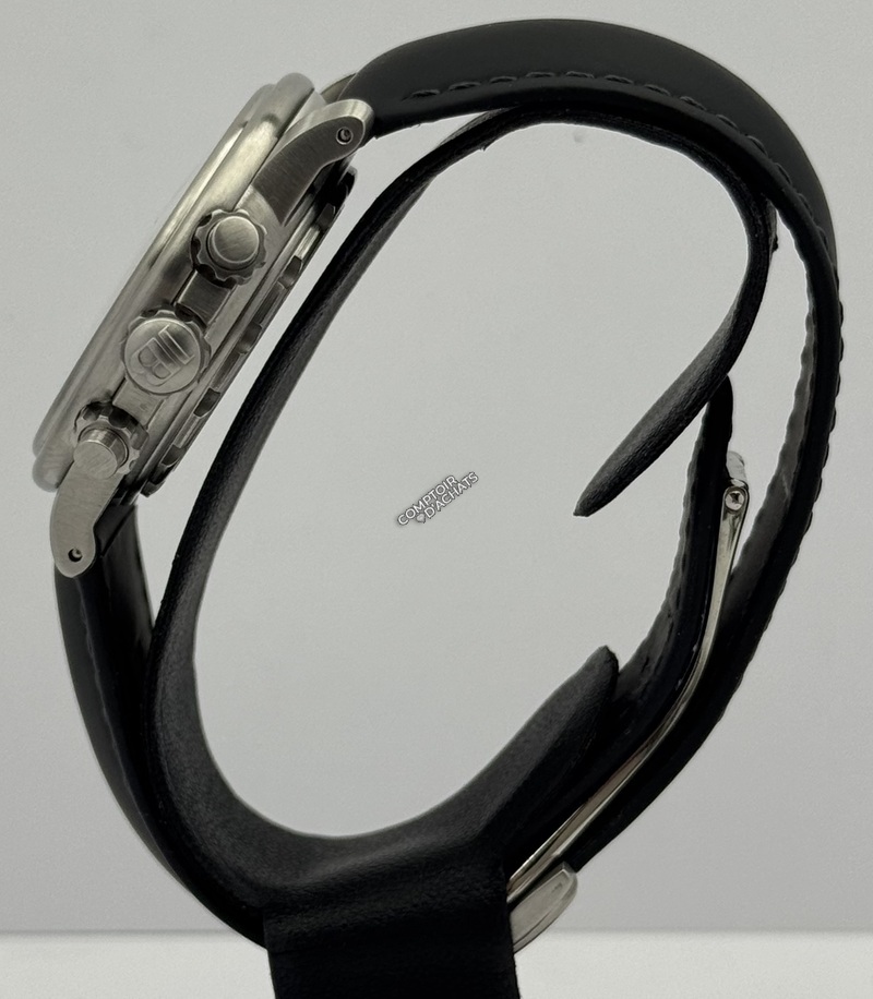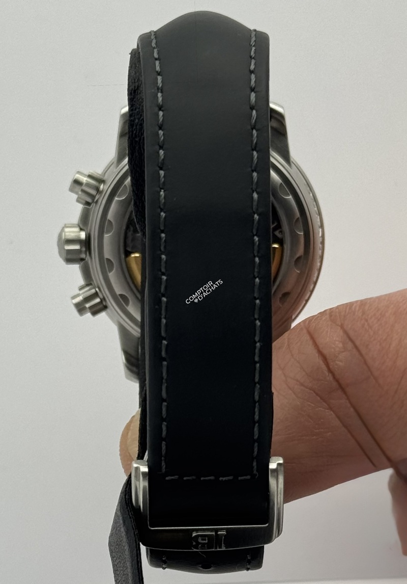 Boîtier en acier satiné de 38 mm, verre saphir antireflet, bracelet caoutchouc noir Aqua Lung. Elle est animée par le calibre automatique 185 Flyback avec fonction chronographe et grande date.
