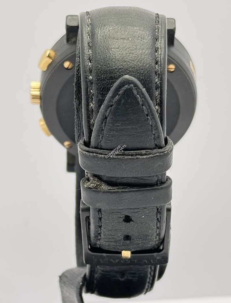 Boîtier : Confectionné en carbone haute technologie, offrant une légèreté exceptionnelle et une résistance accrue. Le boîtier de 38 mm arbore le double logo "BVLGARI BVLGARI" gravé sur la lunette.
