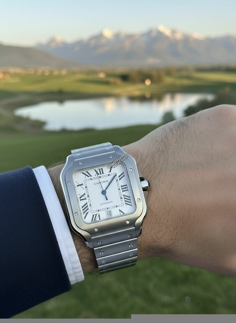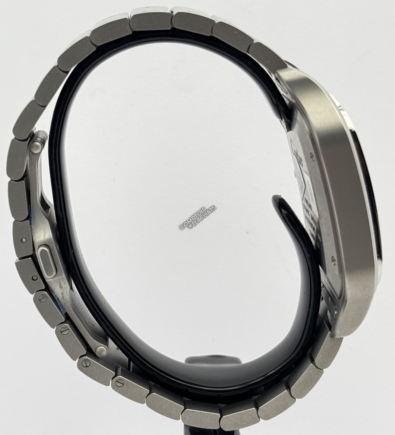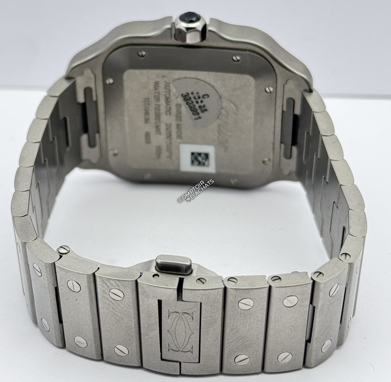 Ce modèle est la Santos de Cartier Grande Taille en Titane, une montre-outil contemporaine qui rend hommage au patrimoine aéronautique de la Maison.