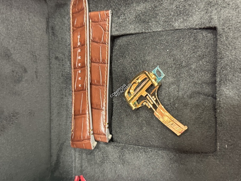 Cette montre est livrée également avec le bracelet crocodile Cartier et boucle déployante en or d’origine et dans un état neuf.