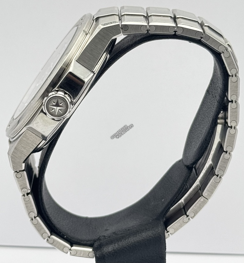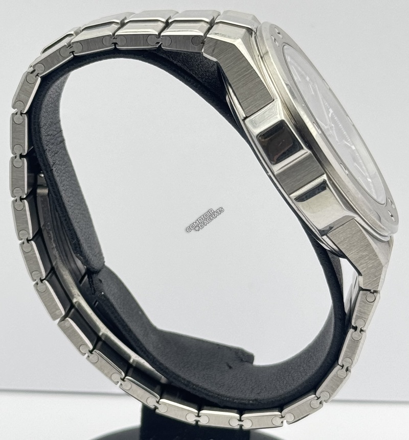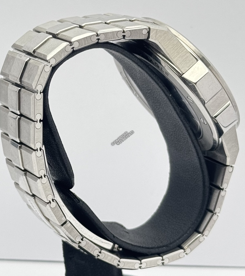 Son identité visuelle est marquée par le design de la collection Alpine Eagle, avec son bracelet intégré et son cadran texturé Gris de Vals. Celui-ci arbore le motif signature de l'Alpine Eagle inspiré de l'iris de l'aigle.