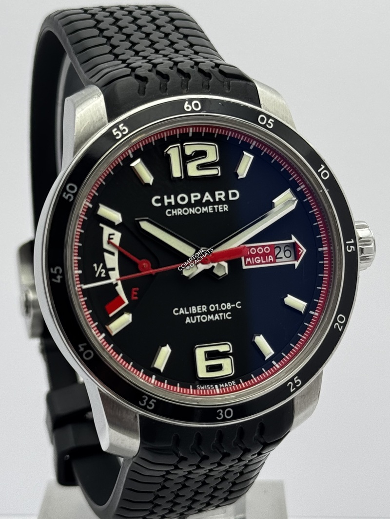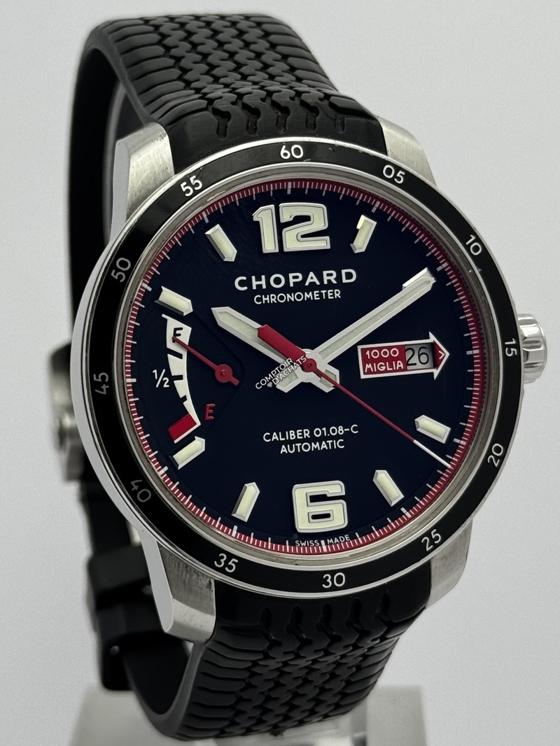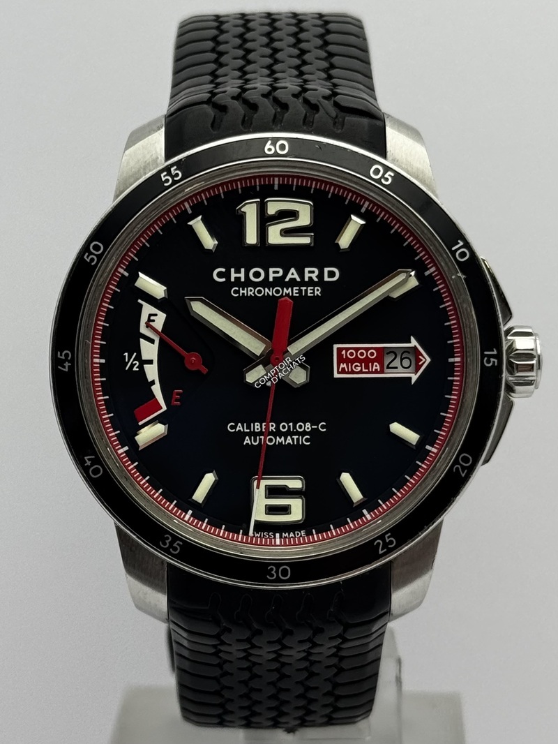 Superbe Chopard Mille Miglia GTS Power Control de 43 mm. Cette montre rend hommage à la célèbre course automobile avec un design sportif et élégant.