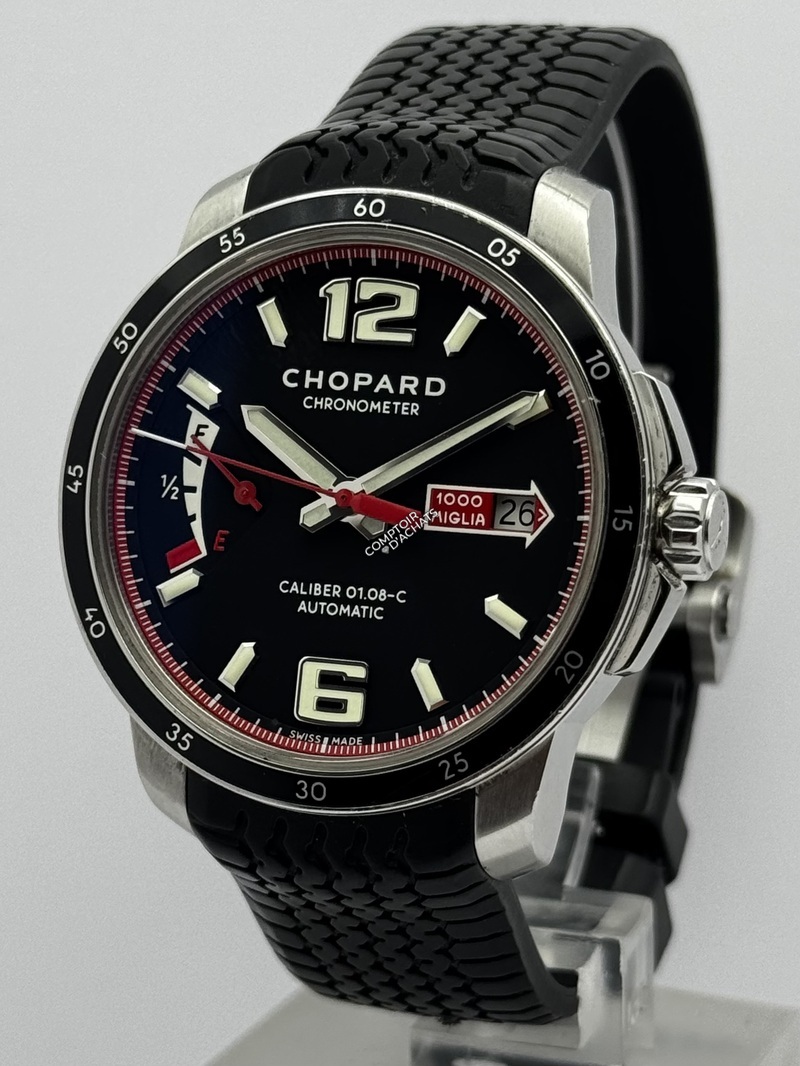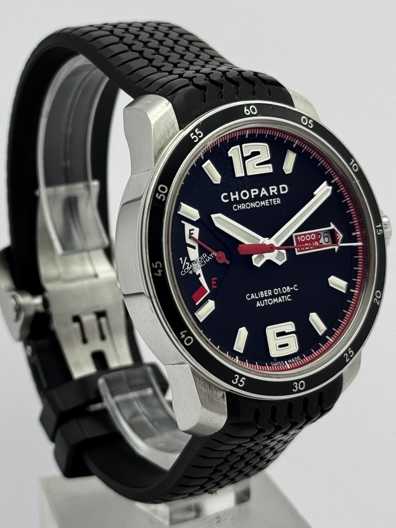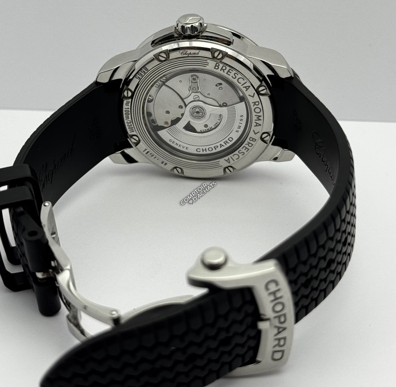 Mouvement : Automatique Calibre Manufacture Chopard 01.08-C, certifié COSC (Chronographe Officiel Suisse des Chronomètres), garantissant une précision maximale.
