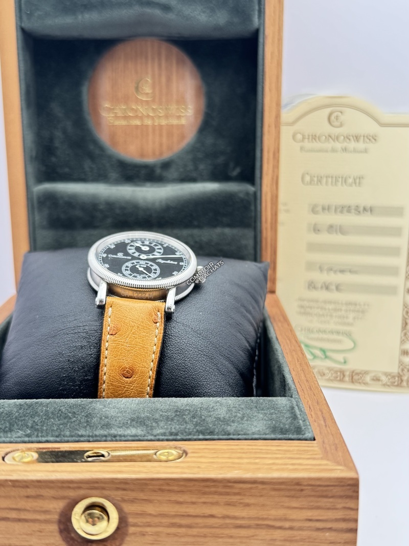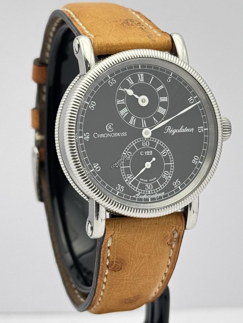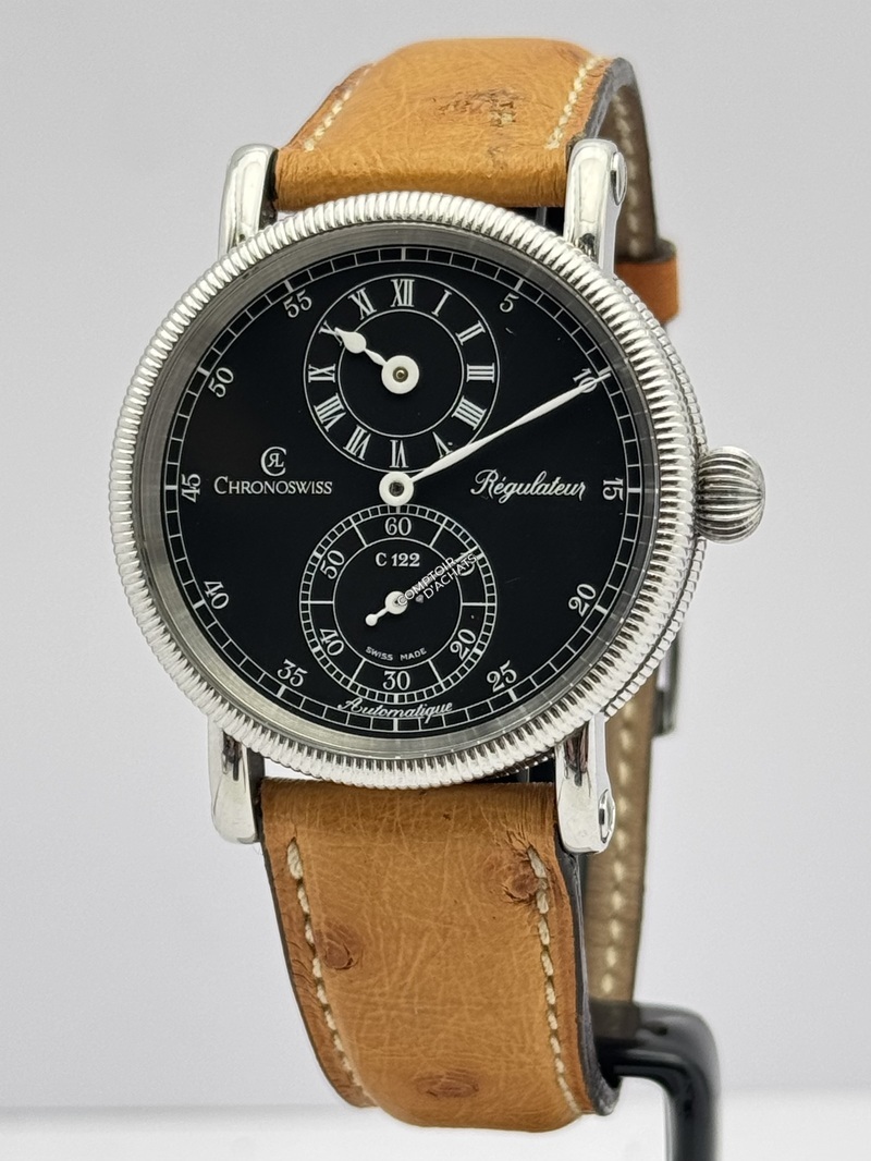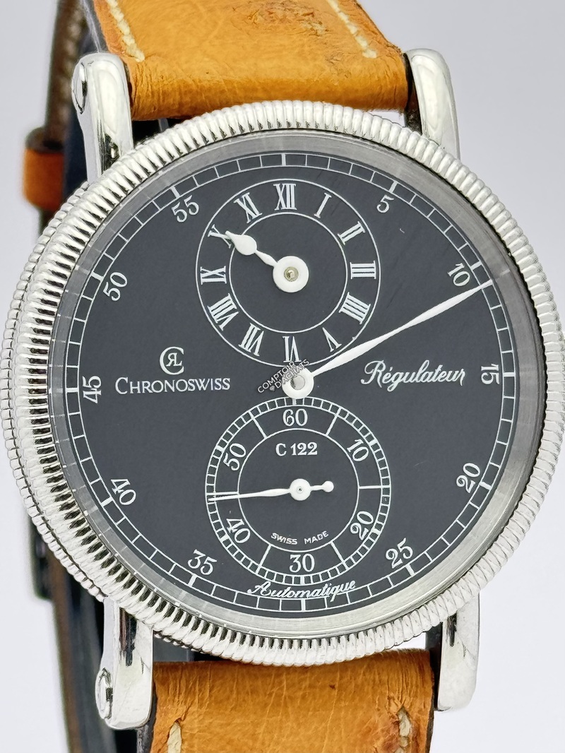 Superbe régulateur classique de Chronoswiss, doté d’un cadran noir élégant avec affichage des heures à 12 heures et des secondes à 6 heures. La montre est équipée du calibre automatique C.122.