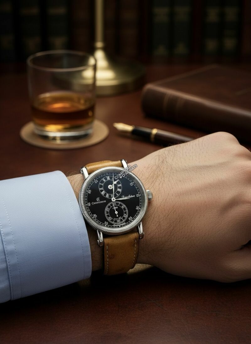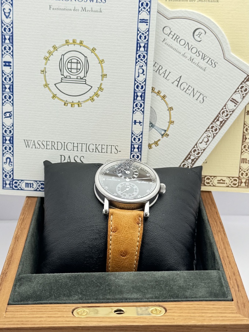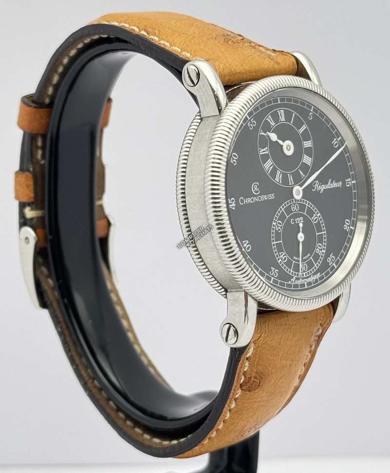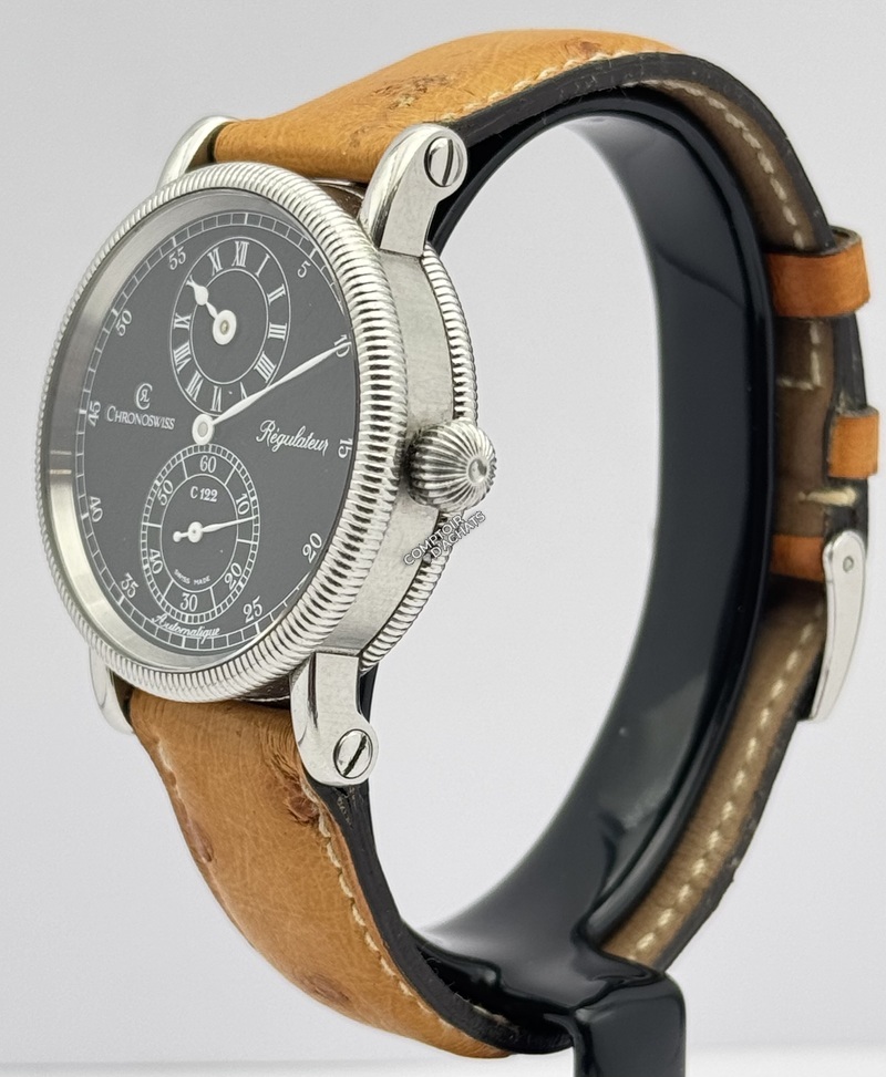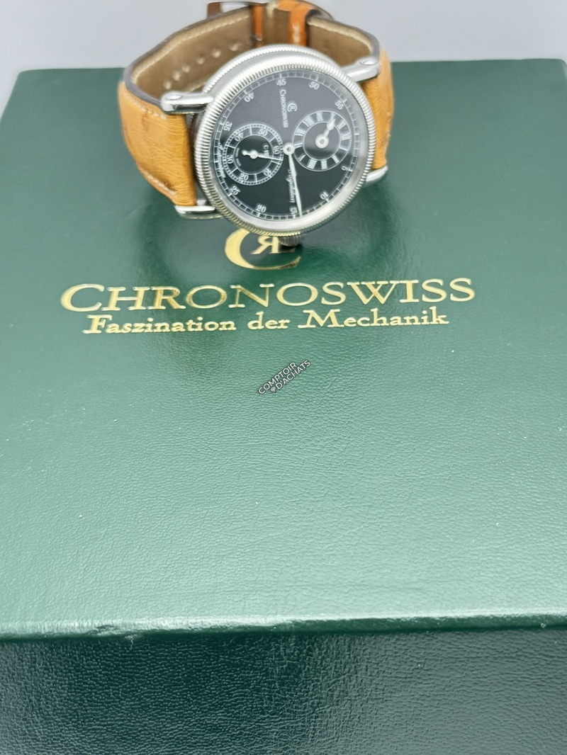Superbe régulateur classique de Chronoswiss, doté d’un cadran noir élégant avec affichage des heures à 12 heures et des secondes à 6 heures. La montre est équipée du calibre automatique C.122.