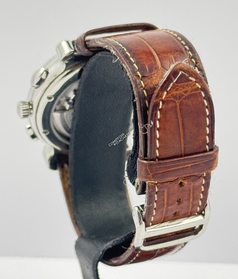 Complications : Chronographe avec trois compteurs (secondes à 3h, heures à 6h, minutes à 9h).