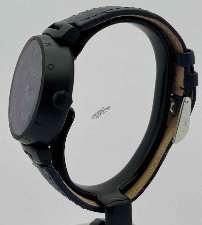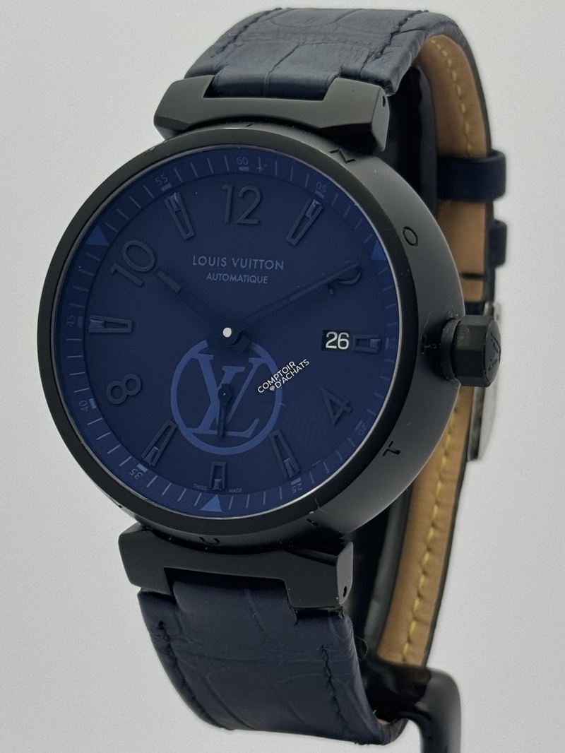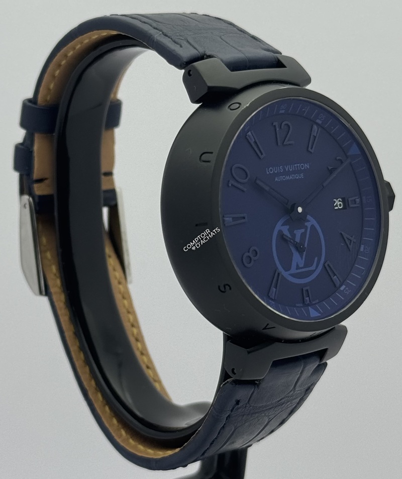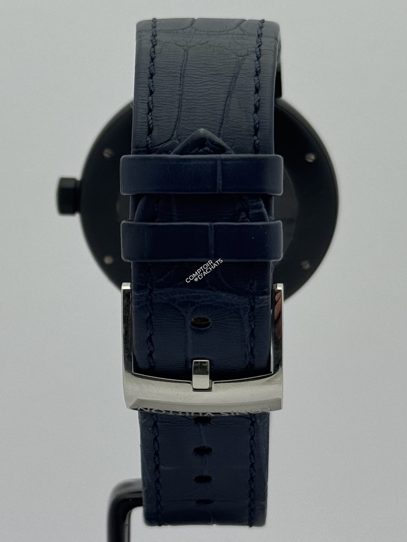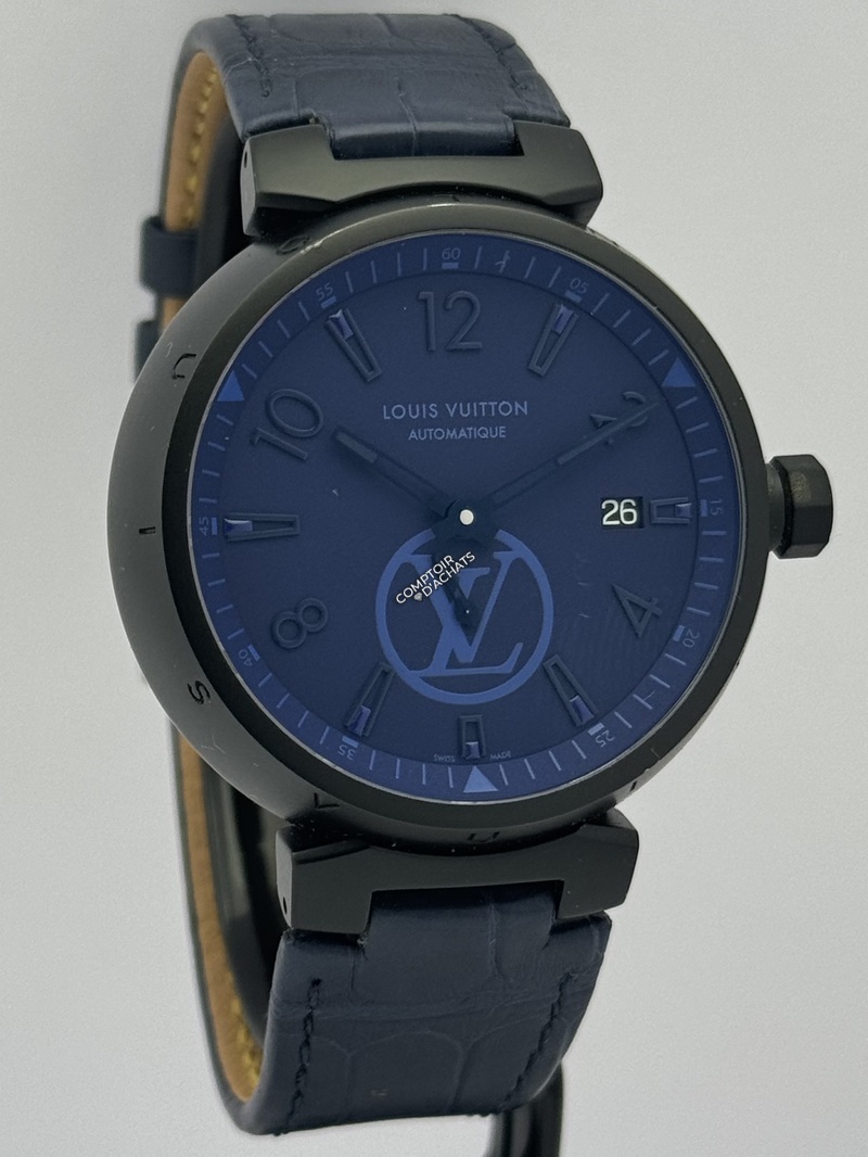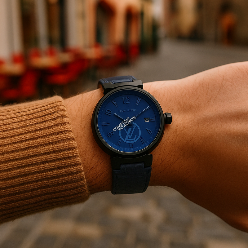 Cadran : Typographie stylisée, guichet de date à 3h, et logo LV surdimensionné pour un rendu graphique percutant.