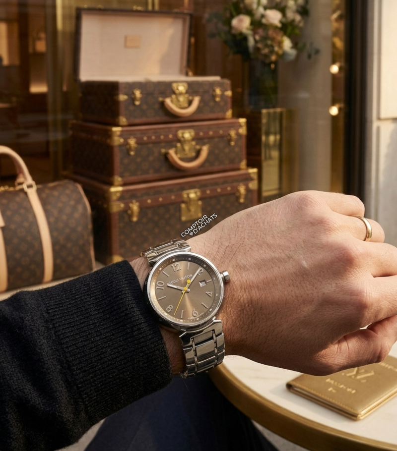 Trotteuse : Aiguille des secondes d'un jaune vif, signature chromatique classique de la maison Louis Vuitton (rappelant le fil utilisé pour la maroquinerie).