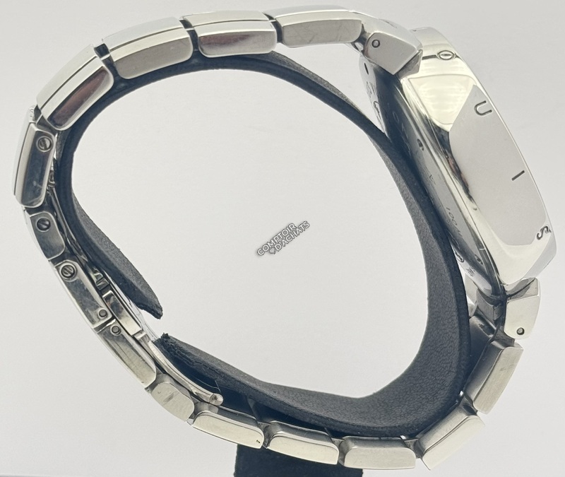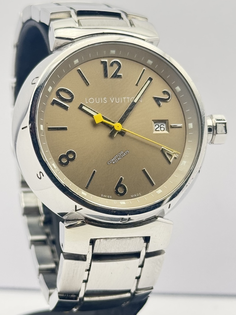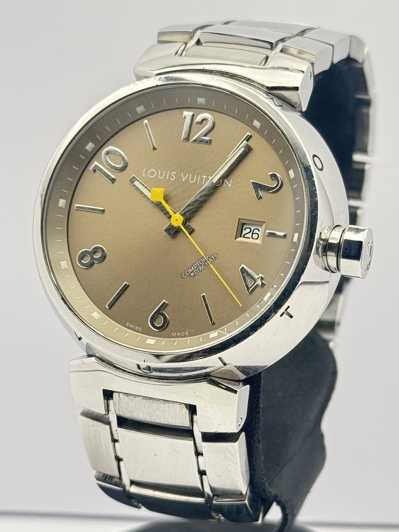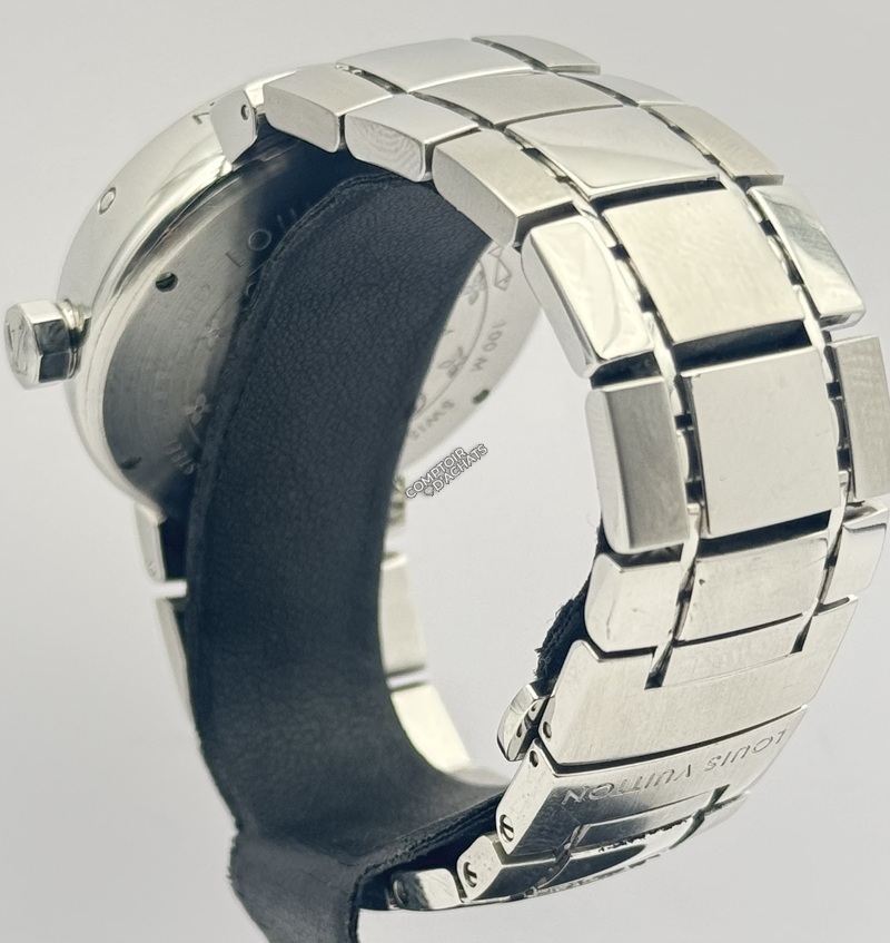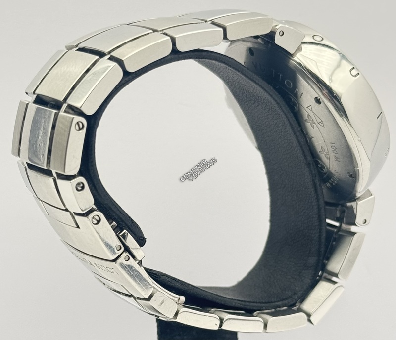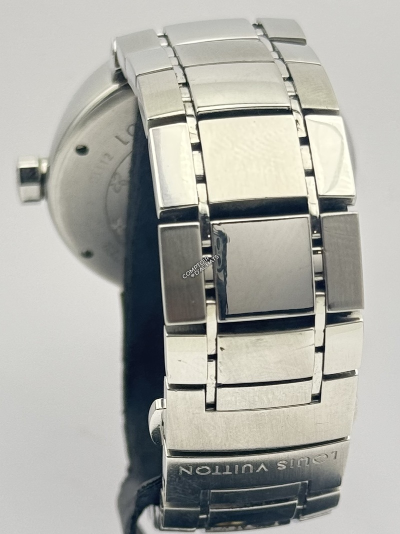 Boîtier : Acier inoxydable poli. Le pourtour du boîtier est traditionnellement gravé des 12 lettres "LOUIS VUITTON" en regard de chaque index horaire.