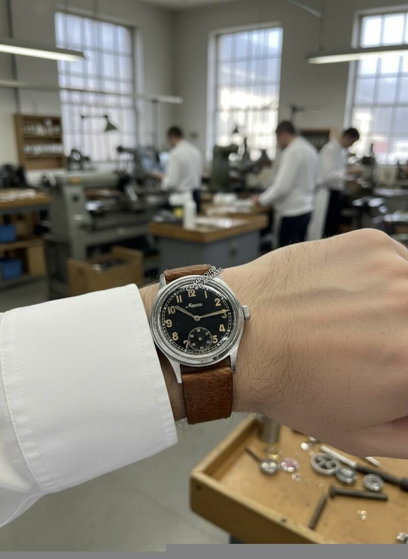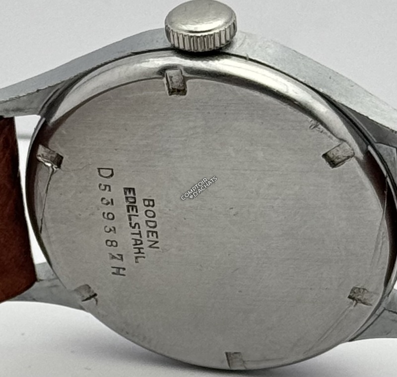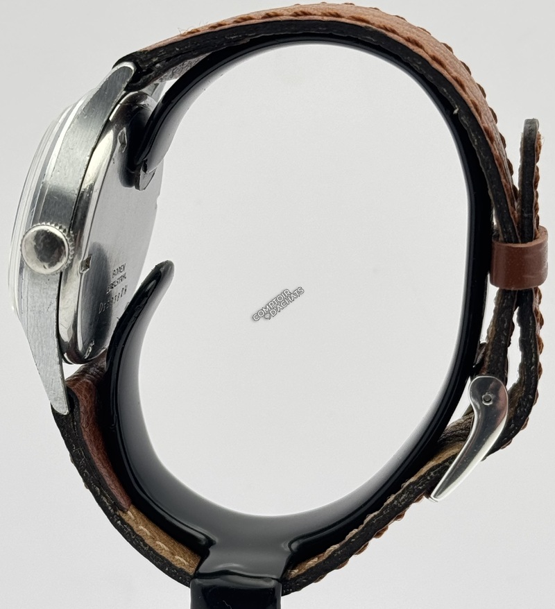 Boîtier : Le boîtier est en métal chromé, et non en acier, une pratique courante pour les montres militaires de cette période afin de réduire les coûts et la production d'acier pour l'effort de guerre. Le diamètre est de 34 mm.