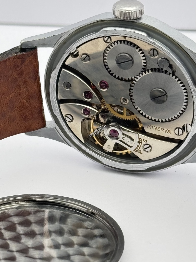 La montre Minerva DH est une pièce de choix pour les collectionneurs de military watches. Elle témoigne de l'horlogerie de service de guerre et de l'histoire du contrat d'approvisionnement horloger de l'Axe. Le boîtier chromé est typique de l'authenticité de ces pièces historiques.