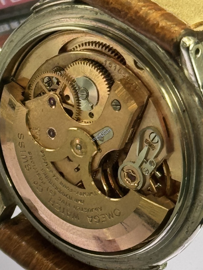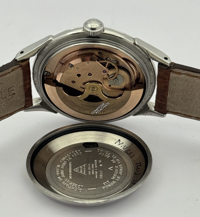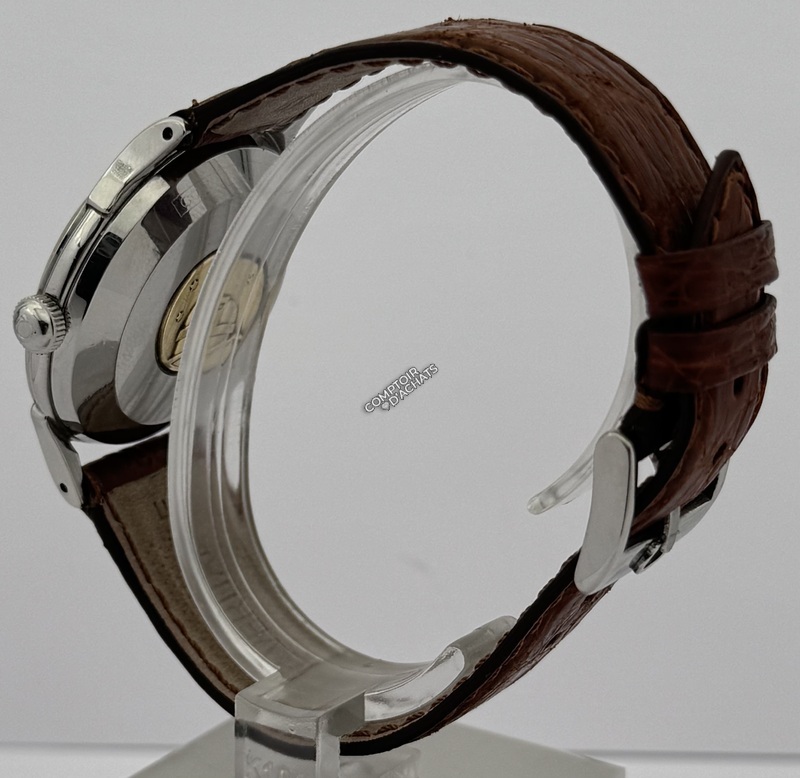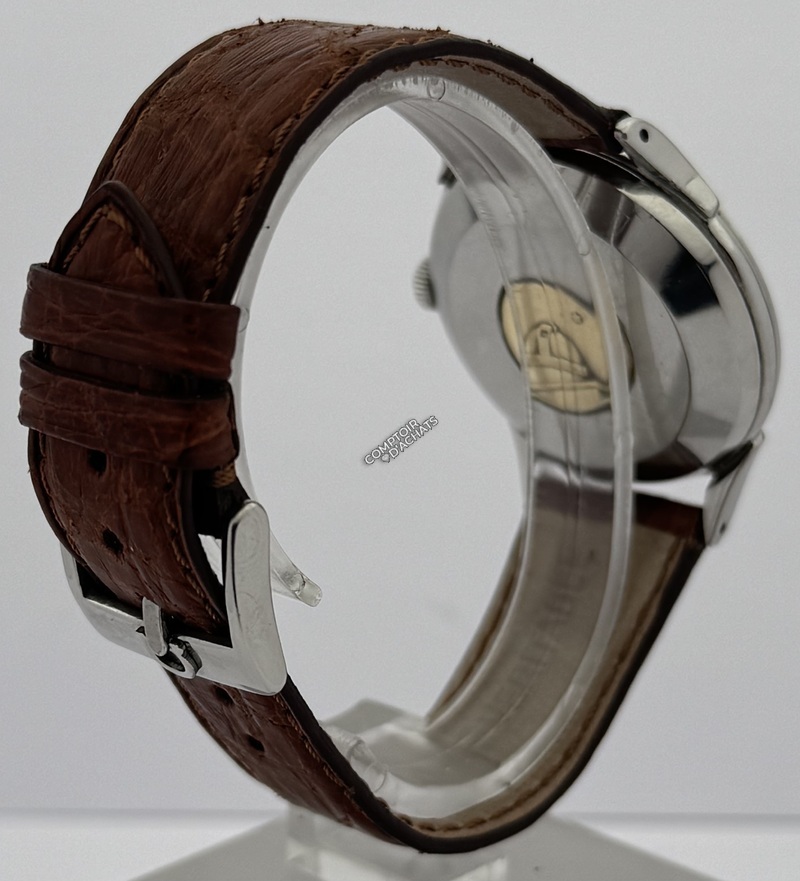 Elle est équipée du mouvement automatique Omega Cal. 505, chronomètre certifié, reconnu pour sa précision et sa fiabilité. Bracelet cuir crocodile brun boucle ardillon.