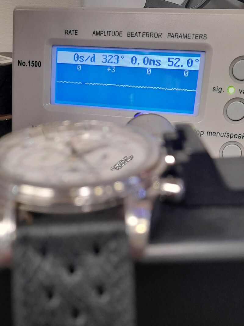 Mouvement chronographe à remontage automatique avec mécanisme de roue à colonnes et échappement coaxial pour une plus grande précision, stabilité et durabilité du mouvement. Balancier à ressort libre, avec heure, minute et petite seconde continue, aiguille centrale du chronographe. Basé sur Piquet 1285.