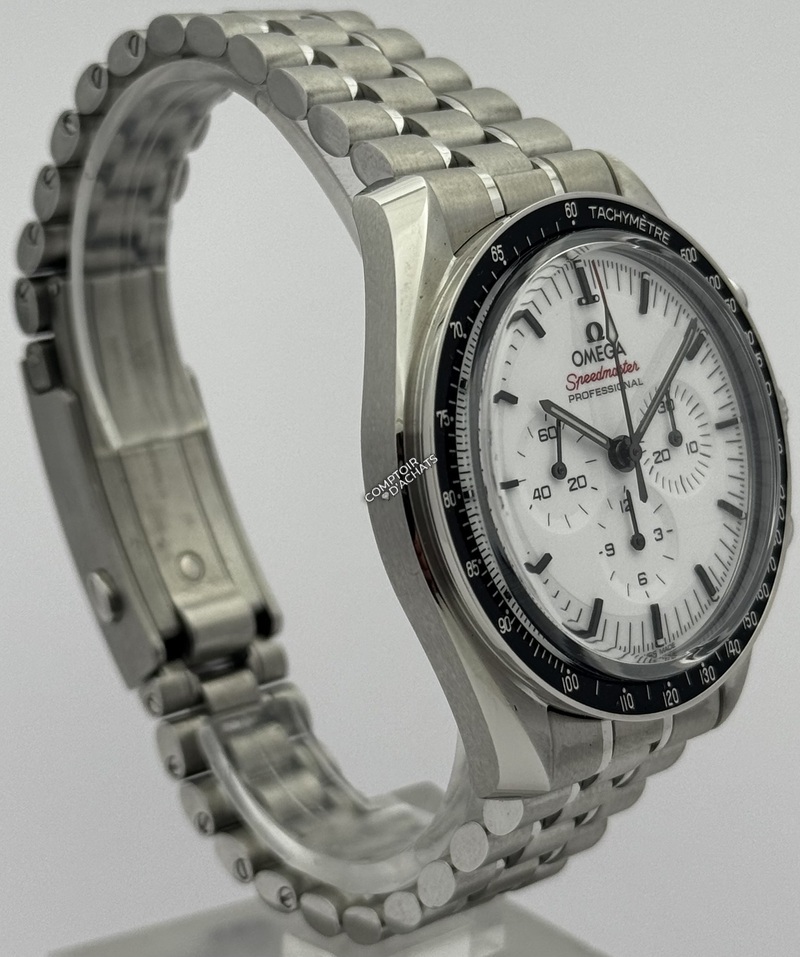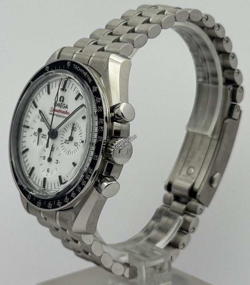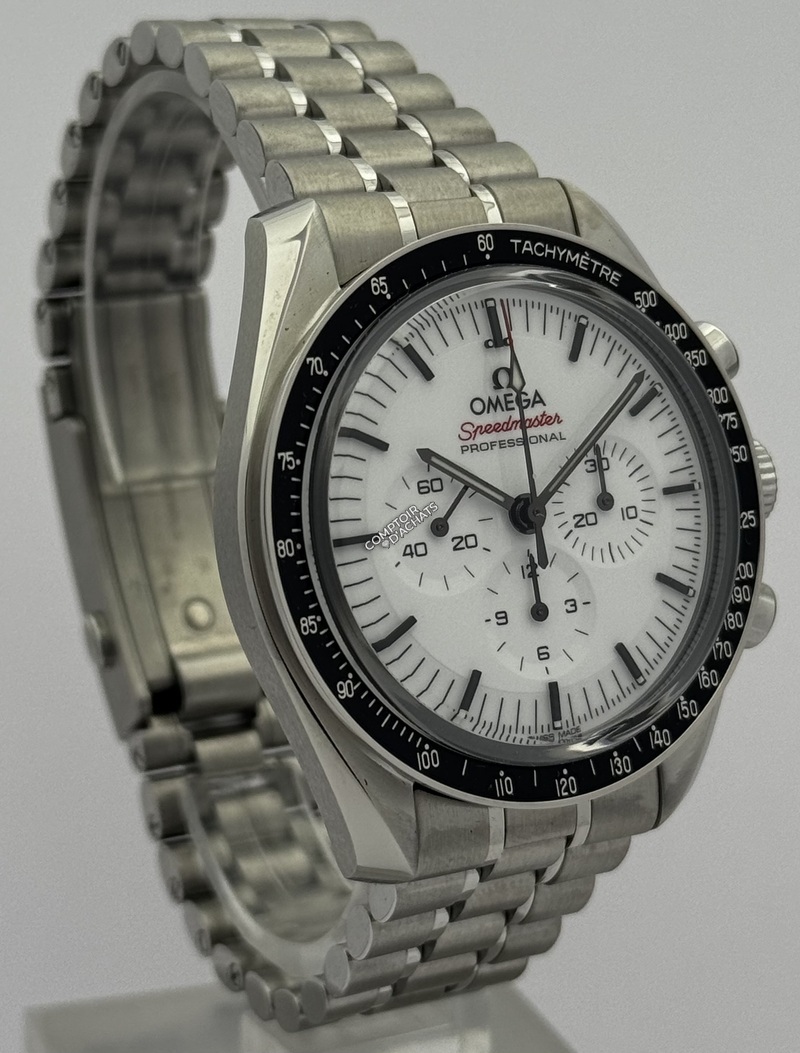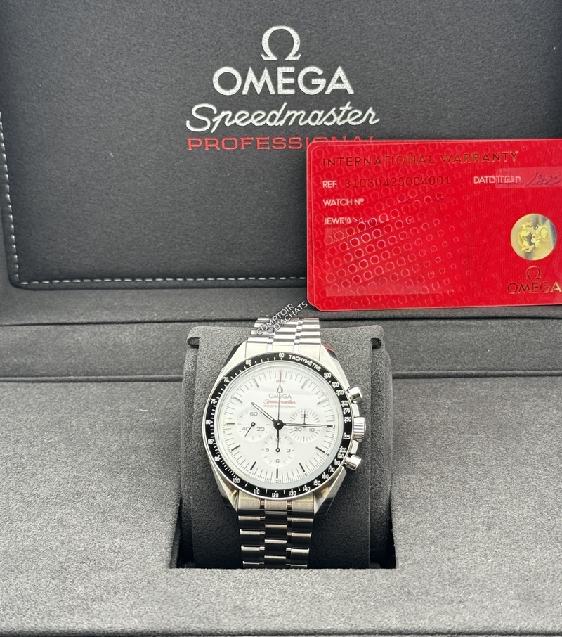 référence 310.30.42.50.04.001 correspond à la célèbre OMEGA Speedmaster Moonwatch Professional Co-Axial Master Chronometer Chronographe 42 mm, avec un cadran blanc, une version très recherchée.