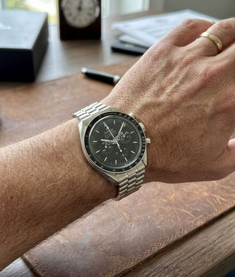 Le coeur de la montre repose sur le calibre manuel Omega 3861, un chronographe certifié Master Chronometer (METAS), doté de l’échappement Co-Axial, offrant une réserve de marche de 50 heures et une résistance magnétique jusqu’à 15 000 gauss pour une précision durable.
