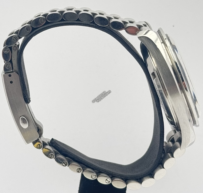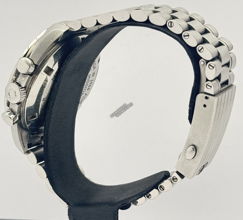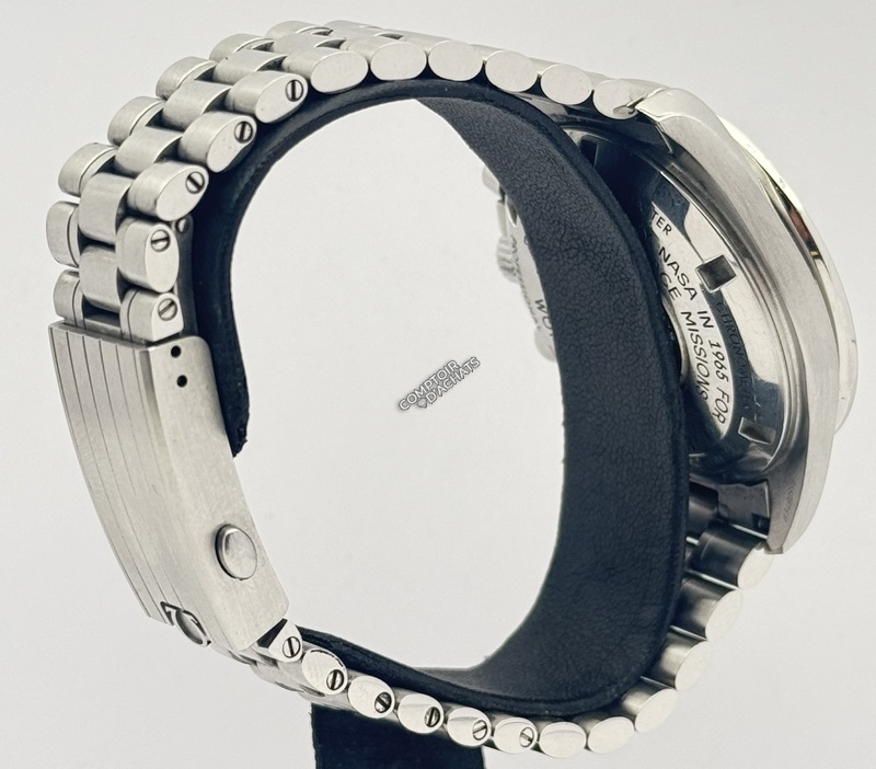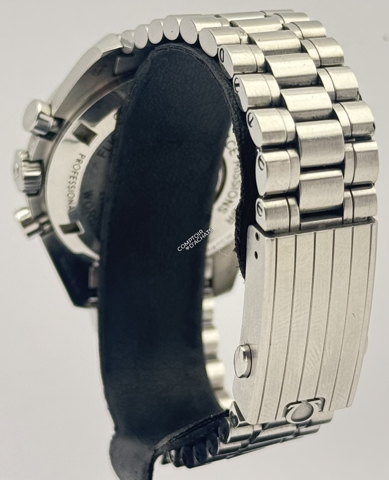 Contrairement à la version saphir, cette référence .001 est équipée d’un verre hésalite et d’un fond plein en acier. Appréciée des puristes, l’hésalite ne vole pas en éclats sous pression (conformément aux exigences de la NASA) et procure une esthétique plus chaleureuse et vintage. Le fond de boîte est gravé de l’hippocampe Omega ainsi que de l’inscription « Flight-Qualified by NASA in 1965 for all manned space missions
