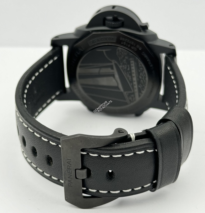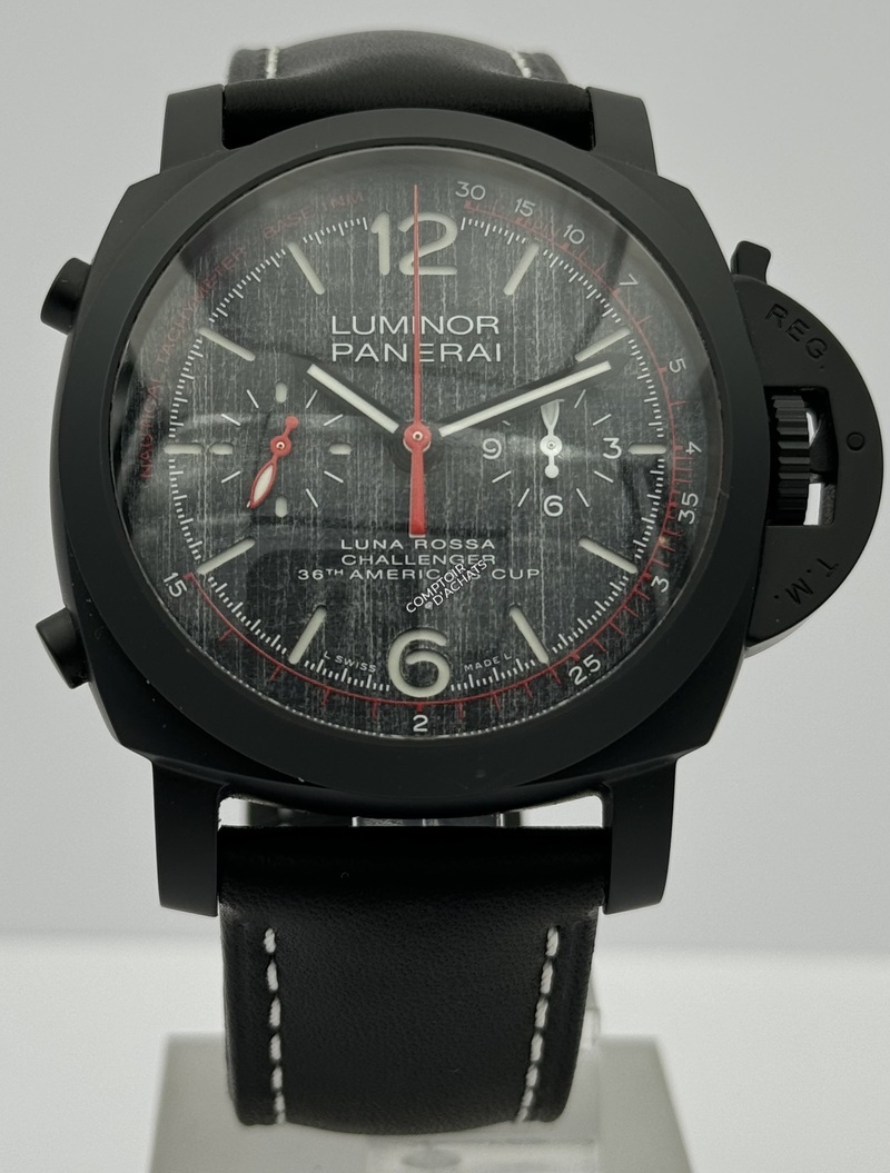 La montre à remontage automatique Officine Panerai Luminor Luna Rossa Chrono Flyback dotée de son bracelet en cuir, est une vraie montre de luxe pour hommes en premier lieu. Prenez note que si l'étanchéité de cette montre est dépendante de sa couronne vissée, il faut savoir que sa couronne ne doit absolument jamais être portée dévissée au risque de gros dégats. Avec un diamètre de 44 mm, cette pièce est assez grande. Elle est donc faite pour les personnes qui veulent cela. Si vous ne maîtrisez pas bien les dimensions des montres, informez-vous bien pour être sûr d'acheter un modèle qui vous plaira vraiment.