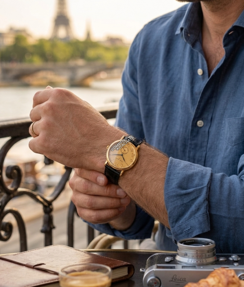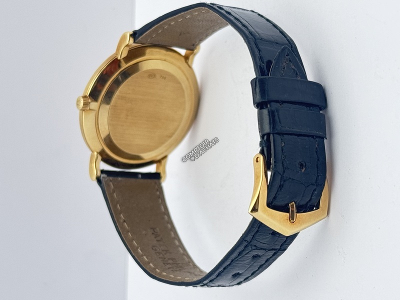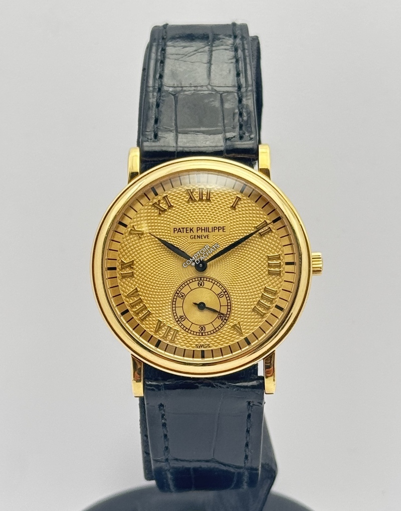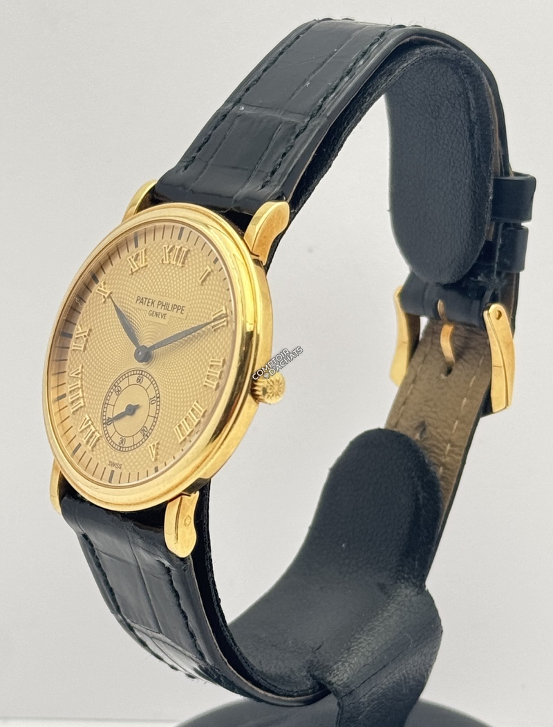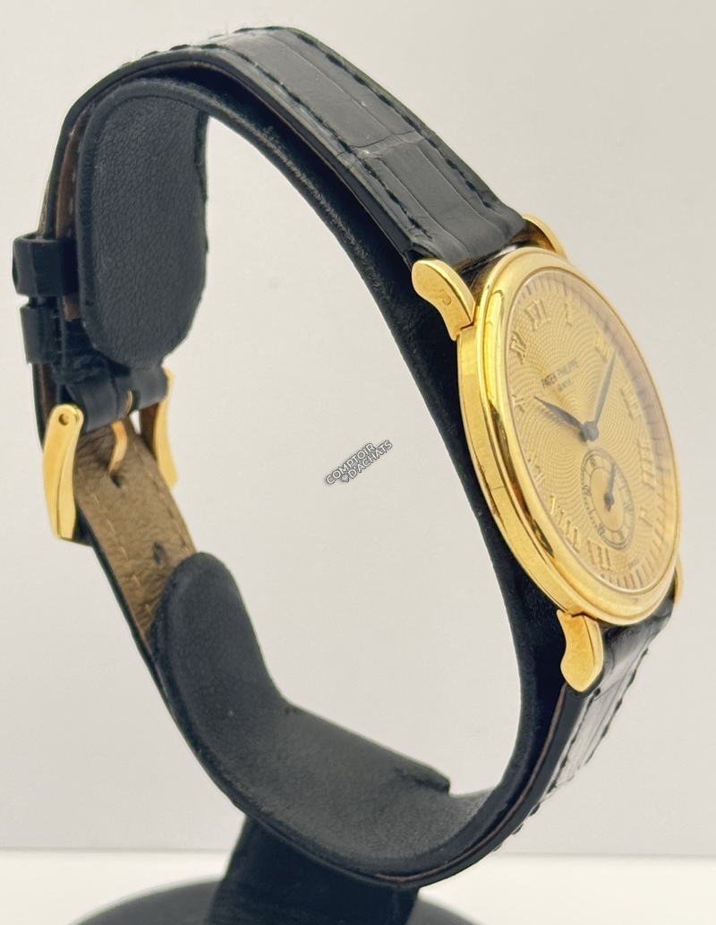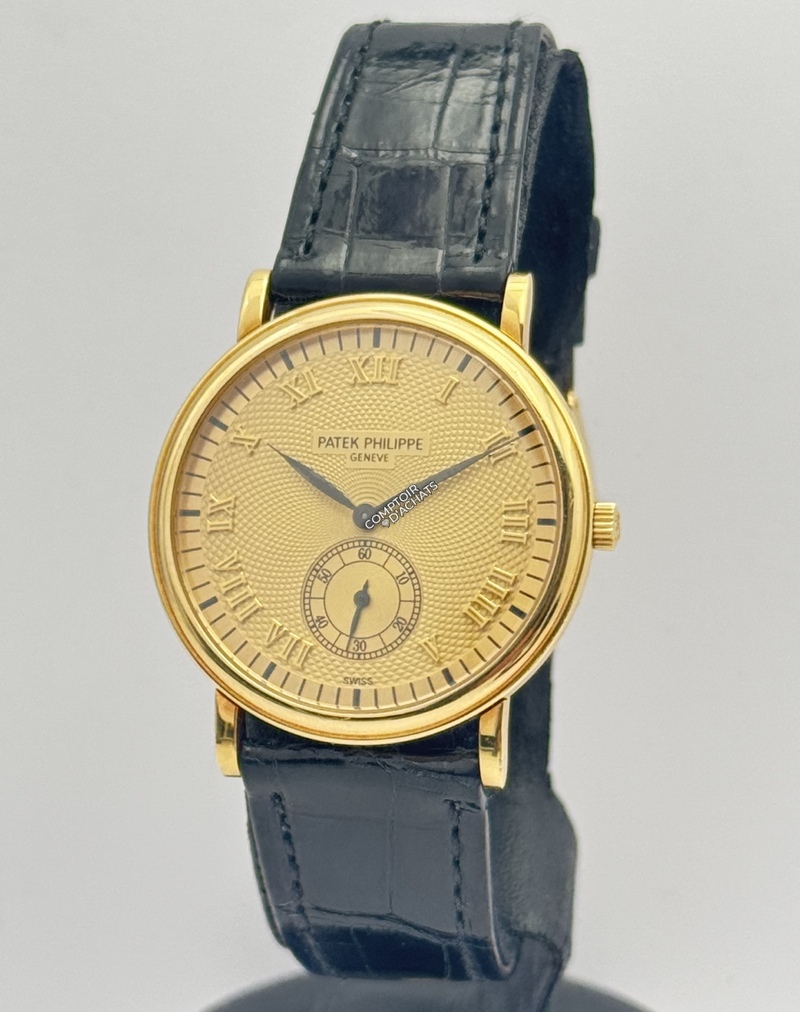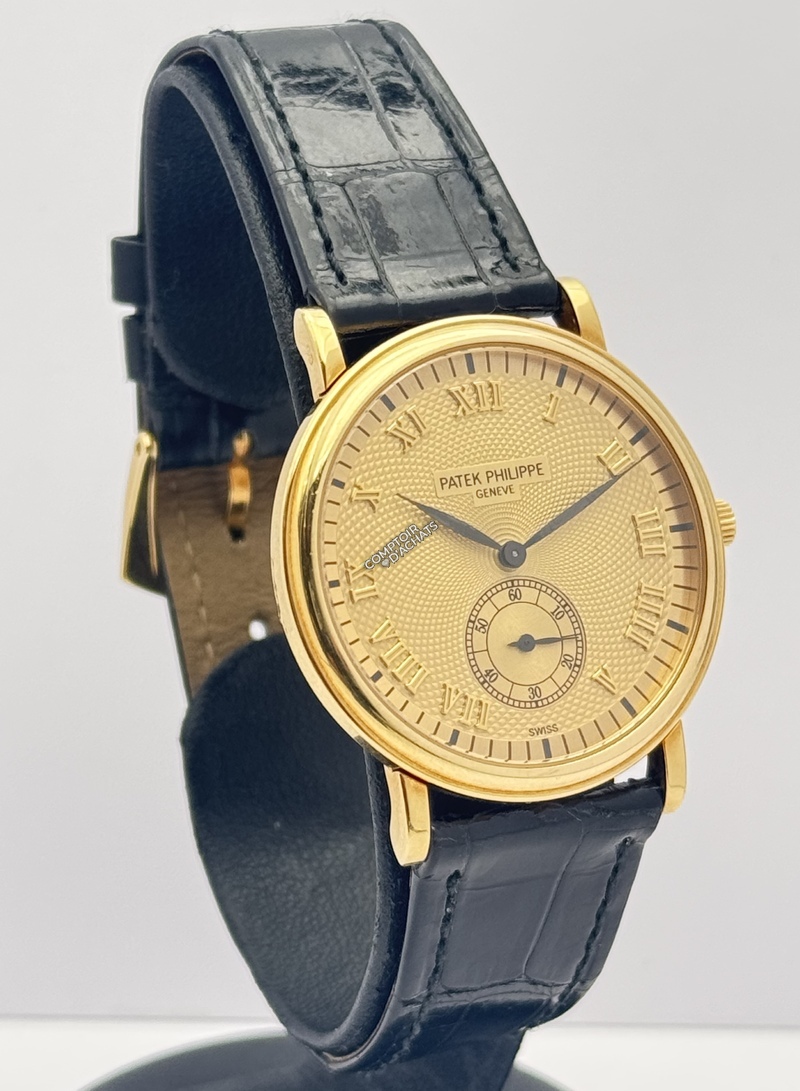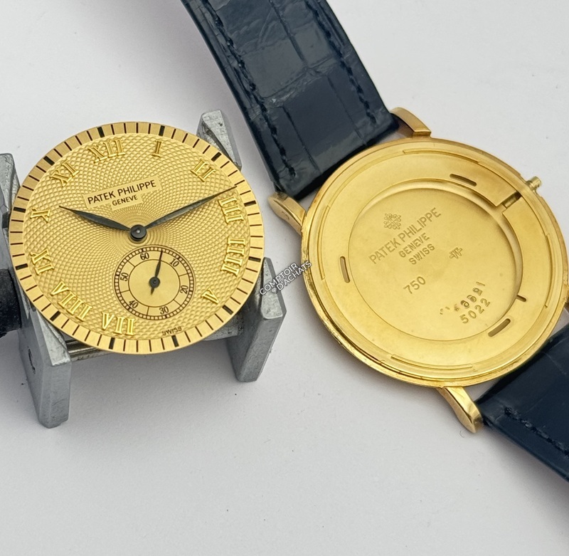 La 5022J-001 est la quintessence de la montre de soirée ("dress watch"). Ce qui la rend spéciale, c'est l'alliance entre le boîtier traditionnel Calatrava et le cadran guilloché, qui est beaucoup plus rare et recherché que les cadrans plats standards. C'est une pièce de collectionneur qui incarne le luxe discret.