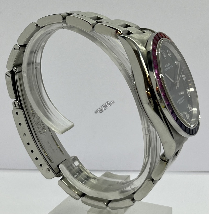 la montre est entièrement d'origine , çe qui a changé est la lunette qui est sertie de Saphirs de couleurs et pierres précieuse , le travail est bien fait le cadran est de couleur vert et les index sont en diamants , l'état général de la montre est très bon ,