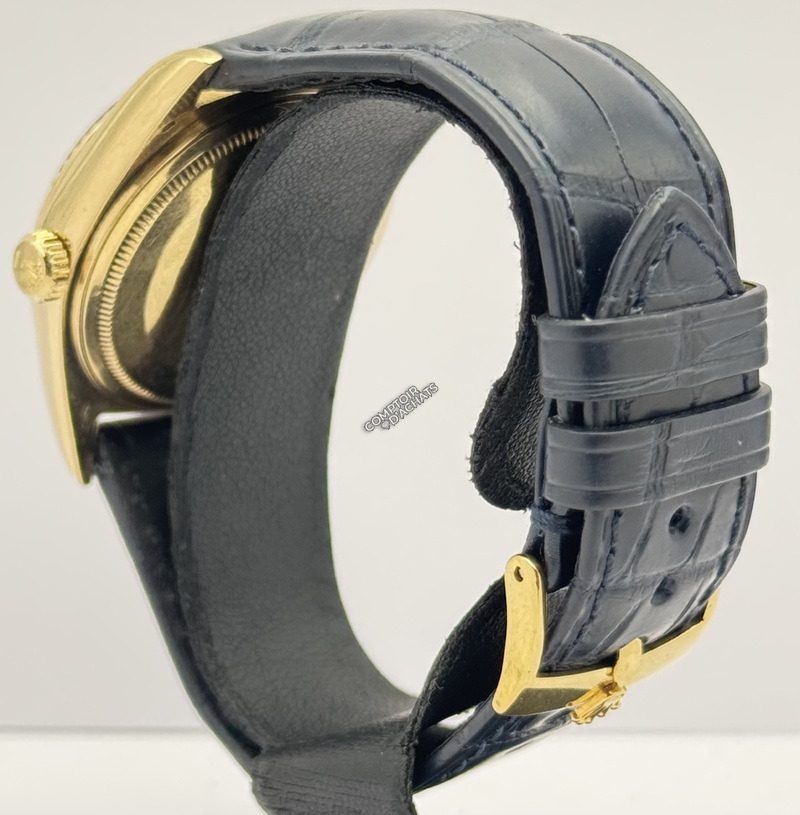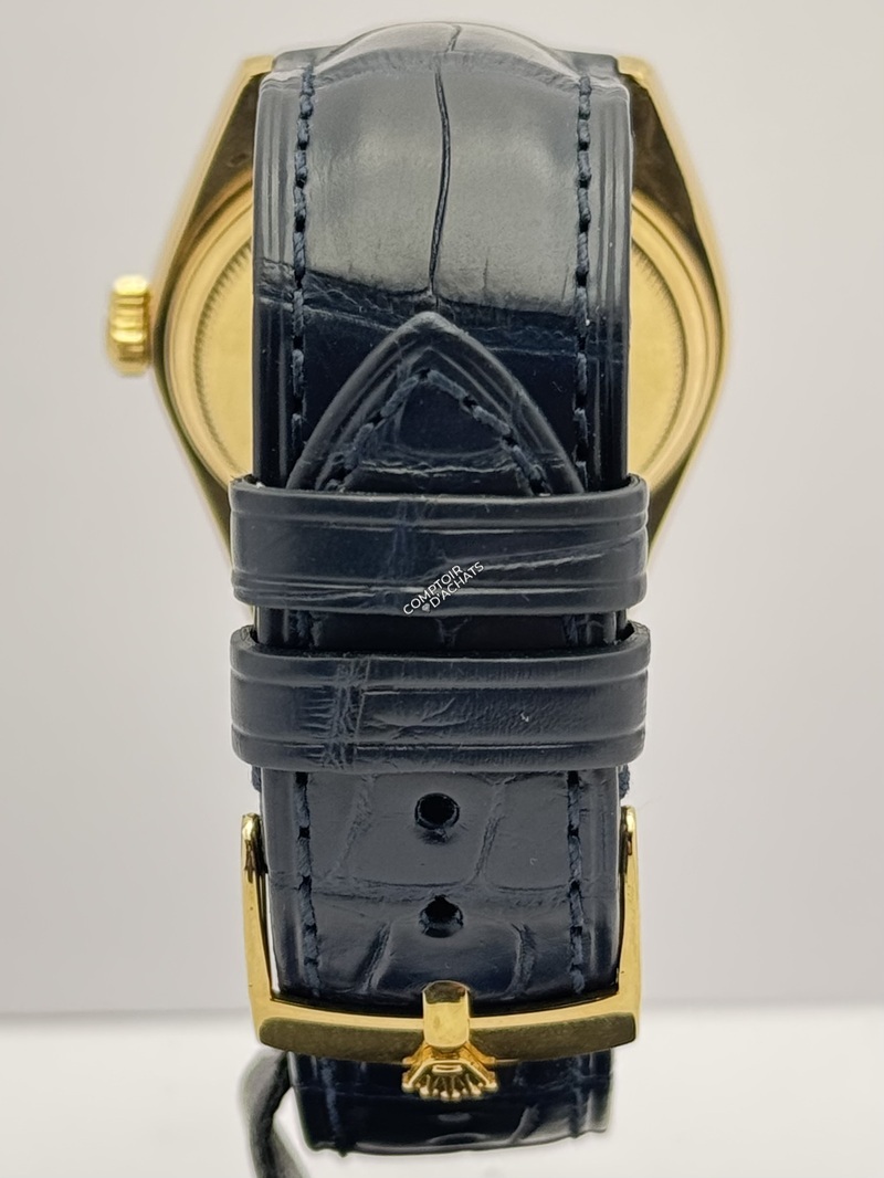 Bracelet : Montée sur un cuir bleu alligator, qui souligne élégamment l'or jaune du boîtier.