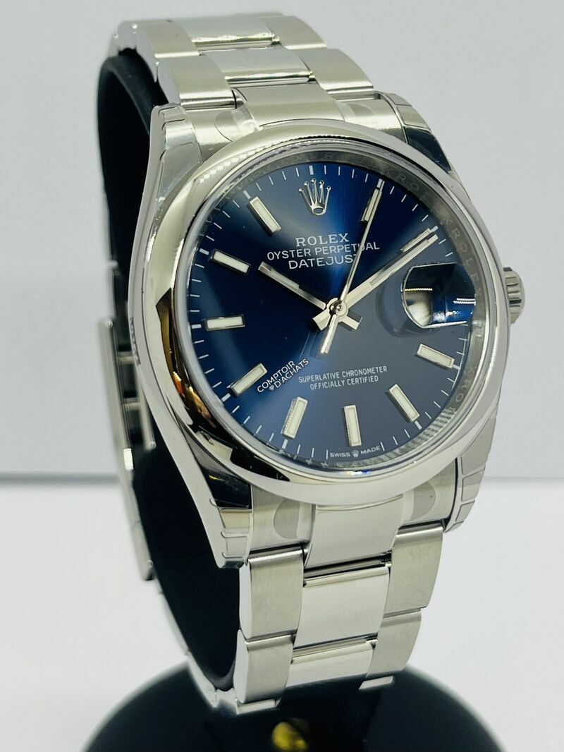 CETTE OYSTER PERPETUAL DATEJUST 36 EN ACIER OYSTERSTEEL EST DOTÉE D’UN CADRAN BLEU VIF ET D’UN BRACELET OYSTER.