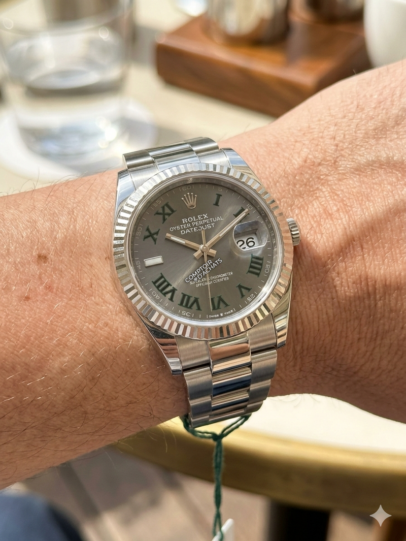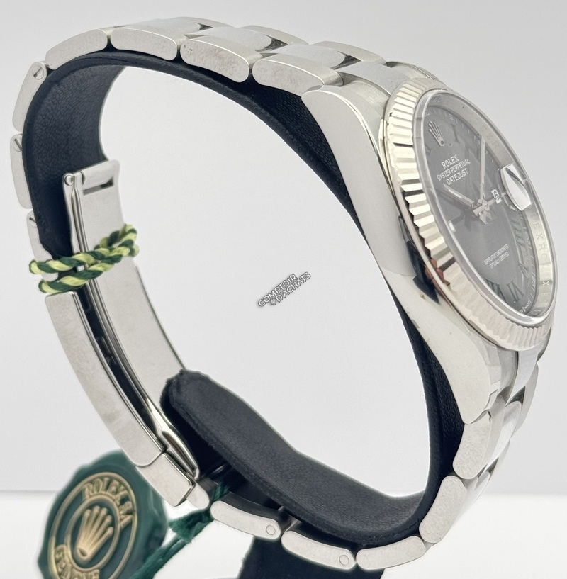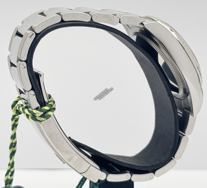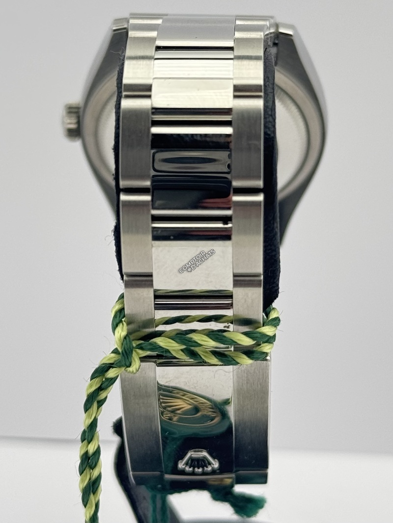 Elle se distingue par son cadran ardoise (Slate) à chiffres romains, élégant et sobre, ainsi que par sa lunette cannelée en or gris 18 ct, véritable signature esthétique de la marque. Son bracelet Oyster à trois mailles larges et plates apporte à la fois confort, robustesse et une touche sportive.