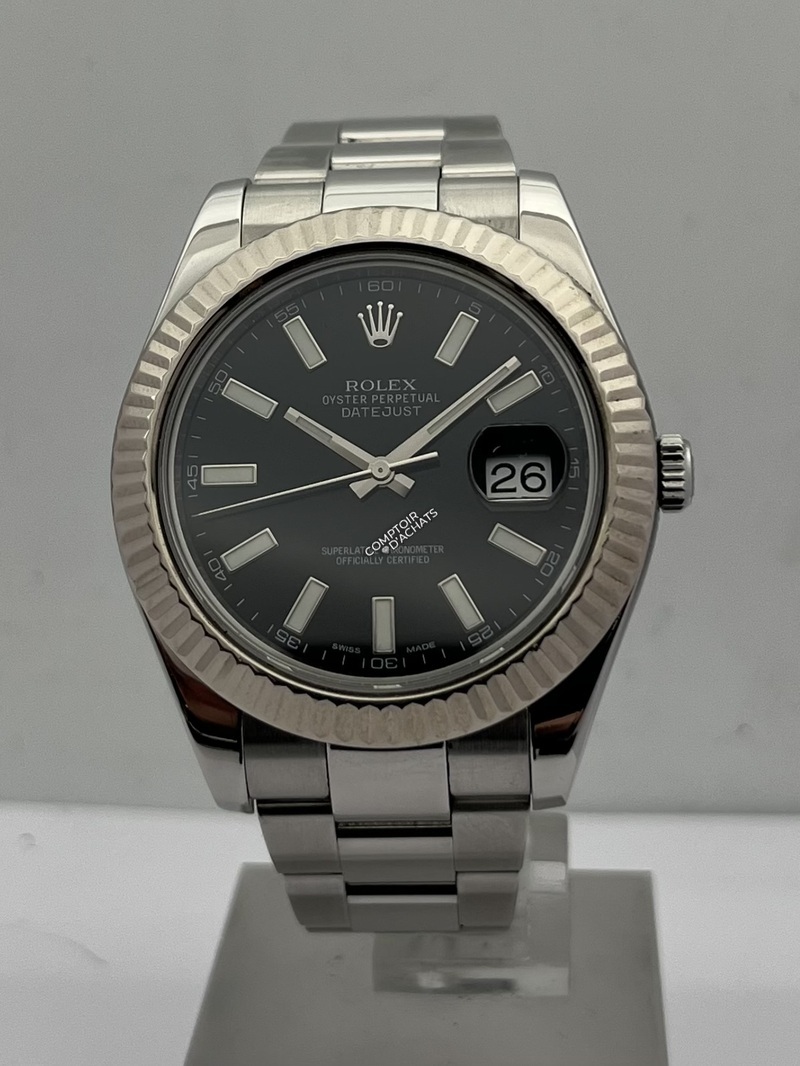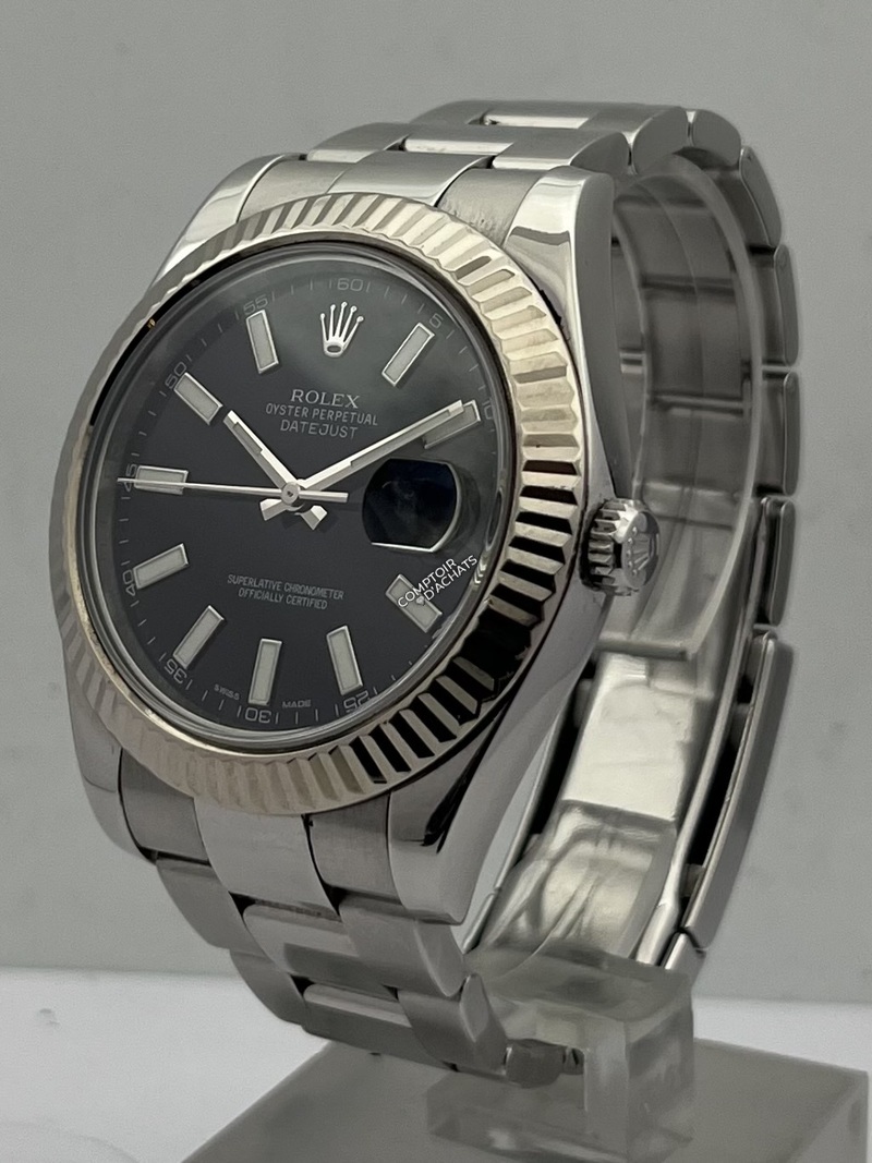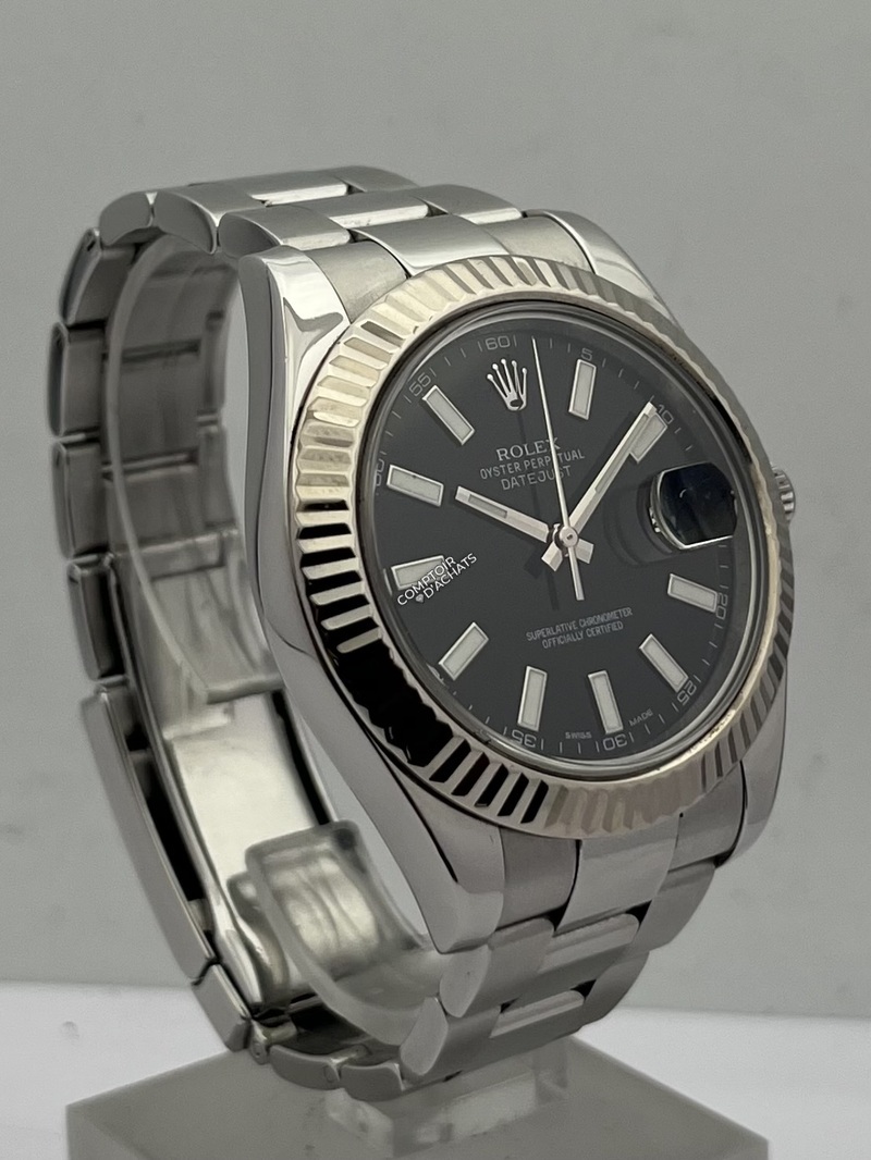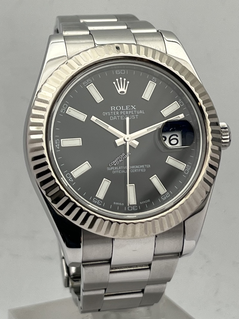 La Rolex Datejust II 116334 est une montre élégante et contemporaine, reconnaissable à son boîtier Oystersteel 41 mm et à sa lunette cannelée en or blanc 18K poli. Ce modèle Swiss Made est animé par le calibre automatique Rolex 3136, certifié chronomètre COSC Superlative, offrant une réserve de marche d’environ 48 heures et la fonction stop-seconde pour un réglage précis.