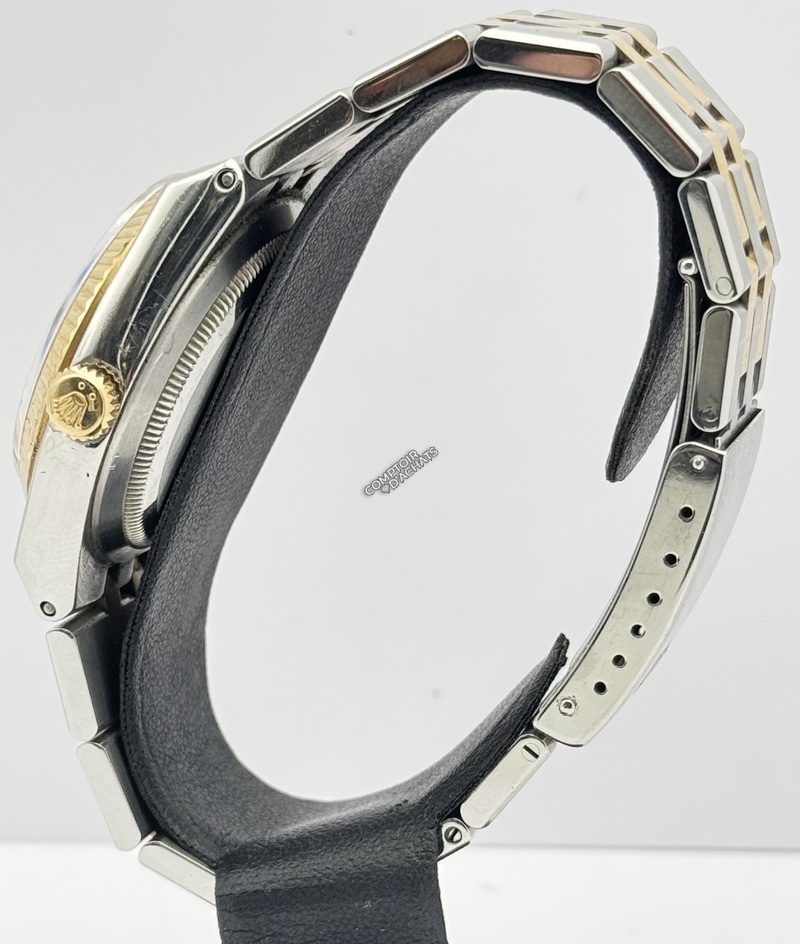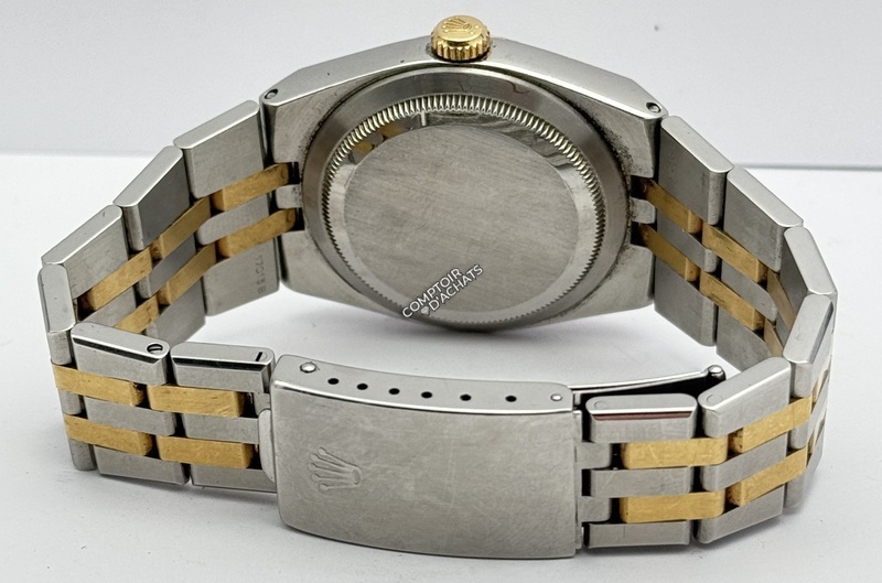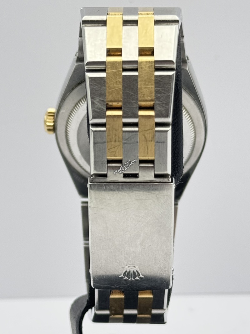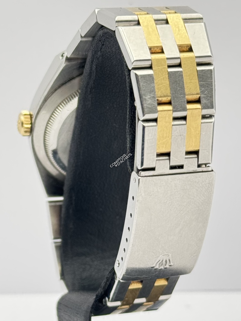 Bracelet Jubilee intégré, bicolore acier et or jaune, spécifique à l’Oysterquartz et non remplaçable car faisant partie du boîtier. Correspond à un poignet taille 20.