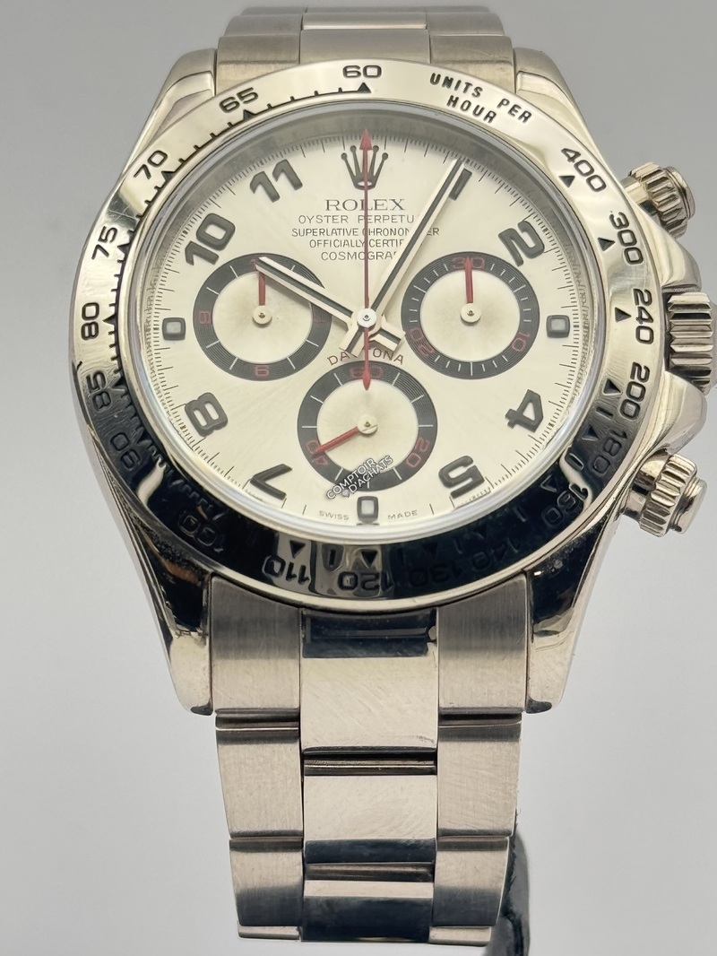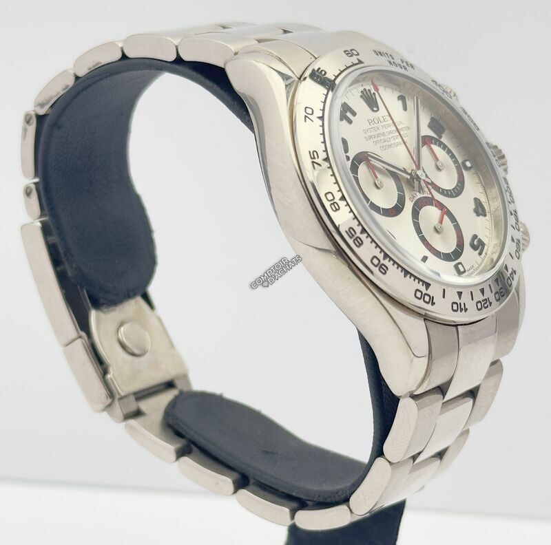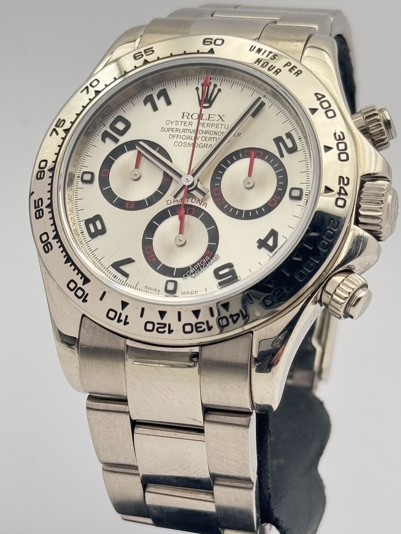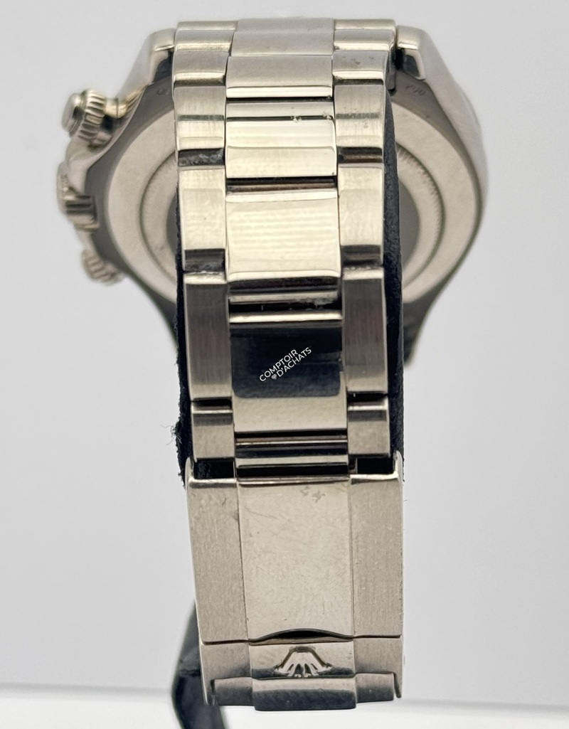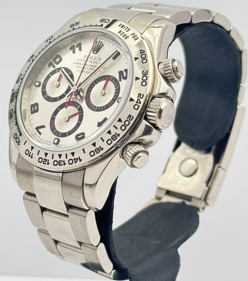 La référence 116509 de la Rolex Daytona incarne l’alliance du prestige de l’or massif et de l’héritage sportif de la collection, avec une construction entièrement en or blanc 18 carats offrant un éclat profond et un poids notable au poignet.