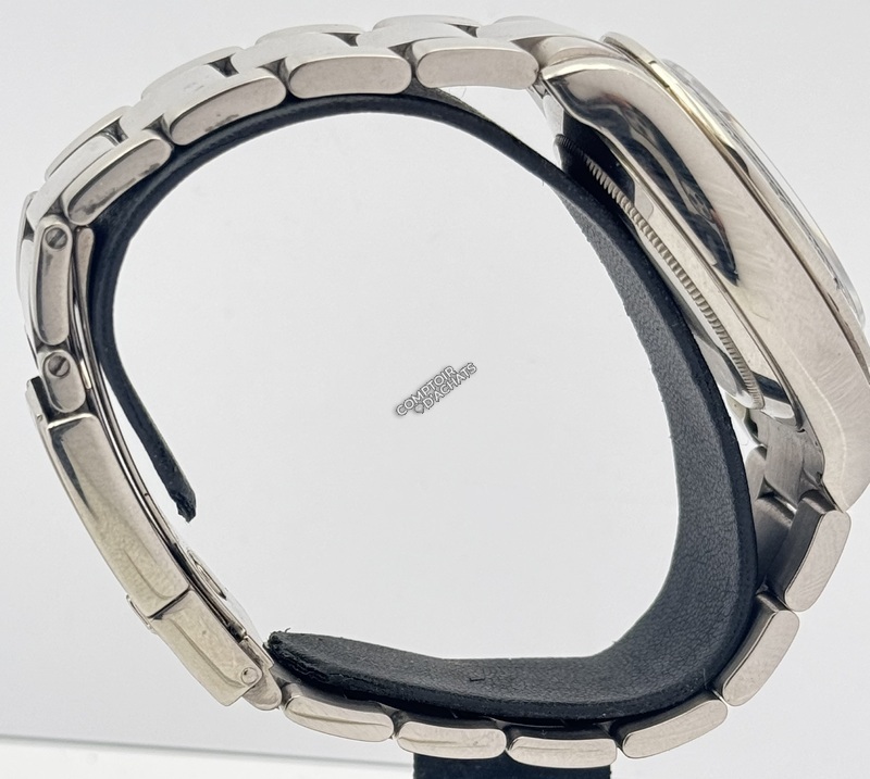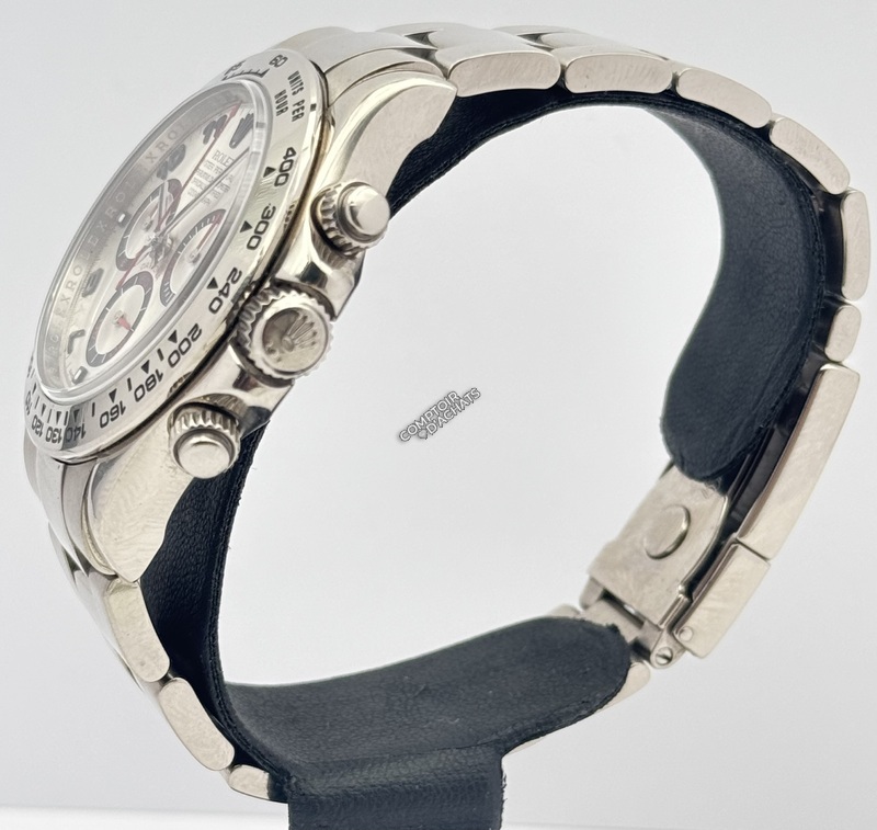Cette configuration sur bracelet or blanc est particulièrement luxueuse et recherchée, avec une esthétique unique mêlant cadran gris métal et accents rouges, tout en offrant la discrétion élégante de l’or blanc, moins ostentatoire que l’or jaune.