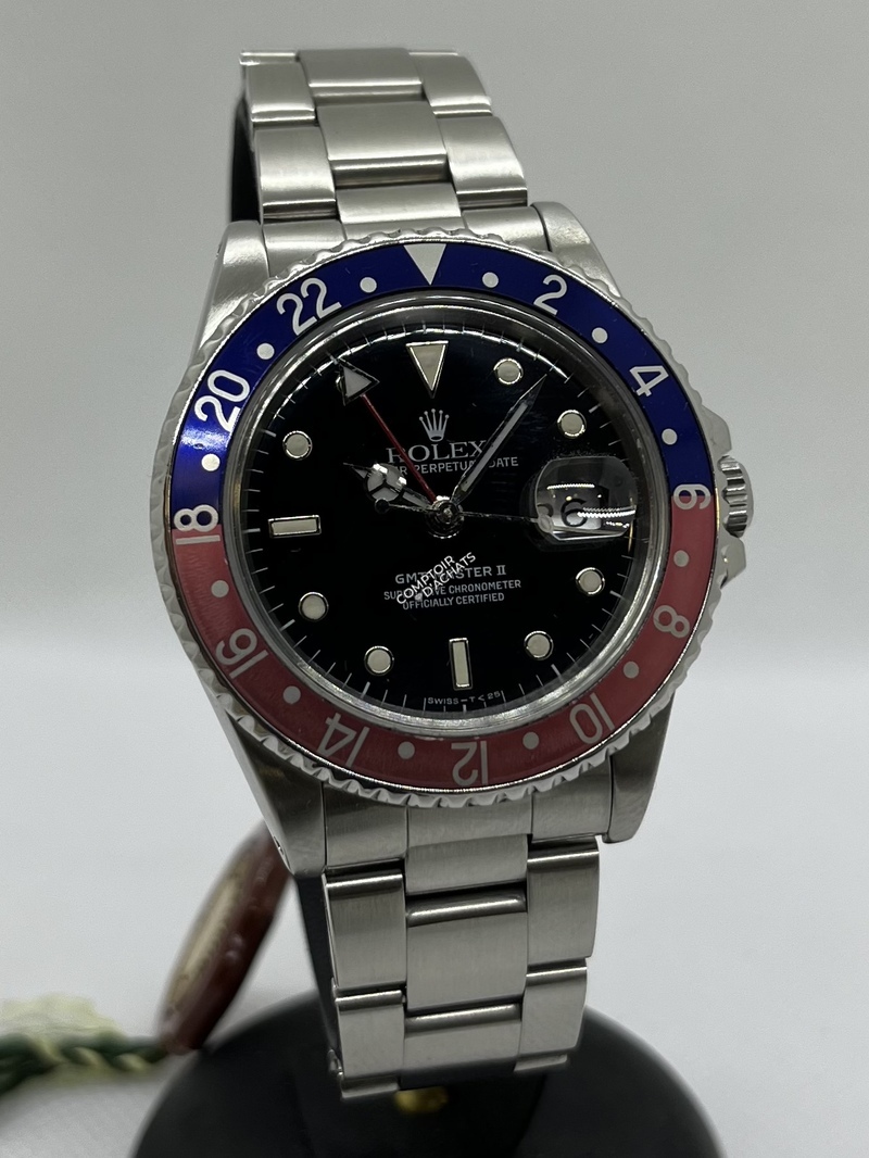 Tout d’abord le boitier de la Rolex GMT Master 16710 est en acier et mesure 40 mm de diamètre pour 12,4 mm d’épaisseur. On est donc sur une taille de montre à complication qui conviendra à une majorité d’homme. Le modèle présenté est une série U et les cornes sont percées. A titre personnel je trouve cela plus esthétique et plus vintage que les cornes pleines telles qu’on les retrouve sur les références actuelles.
