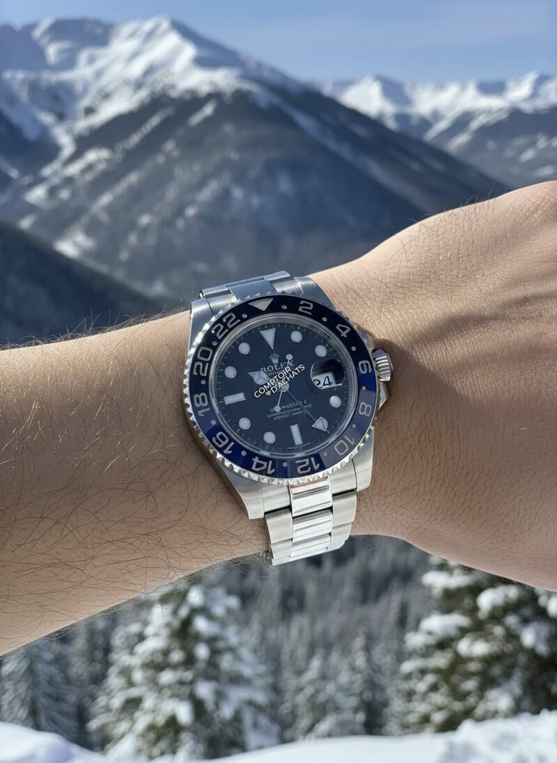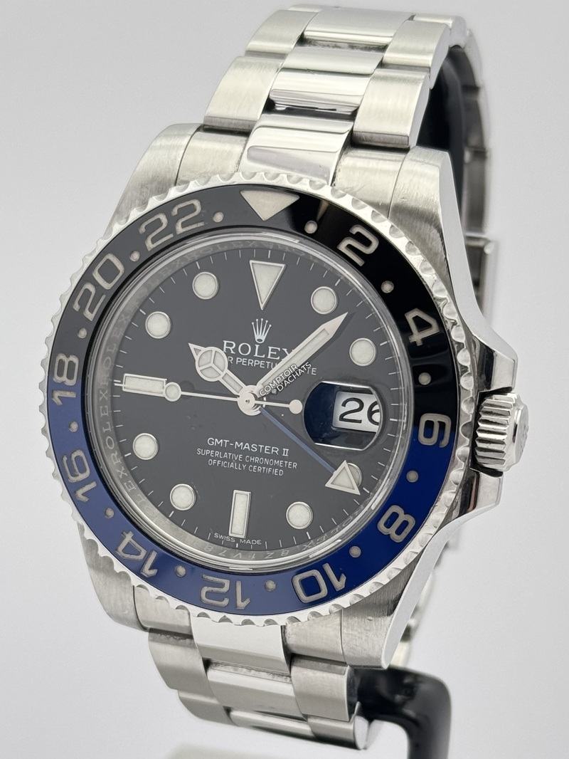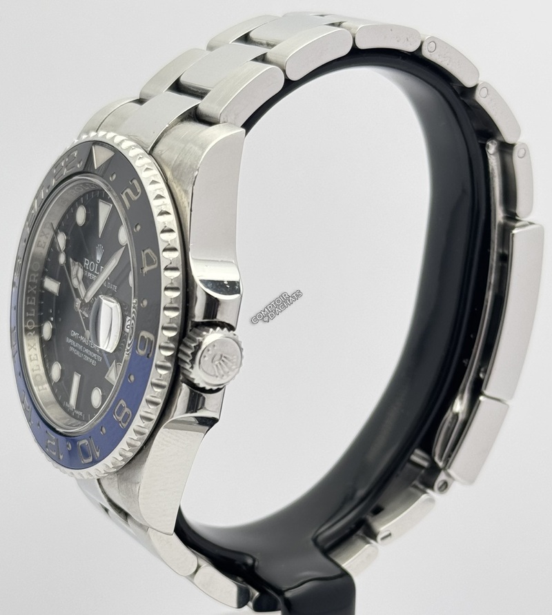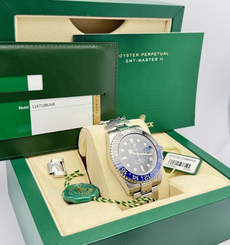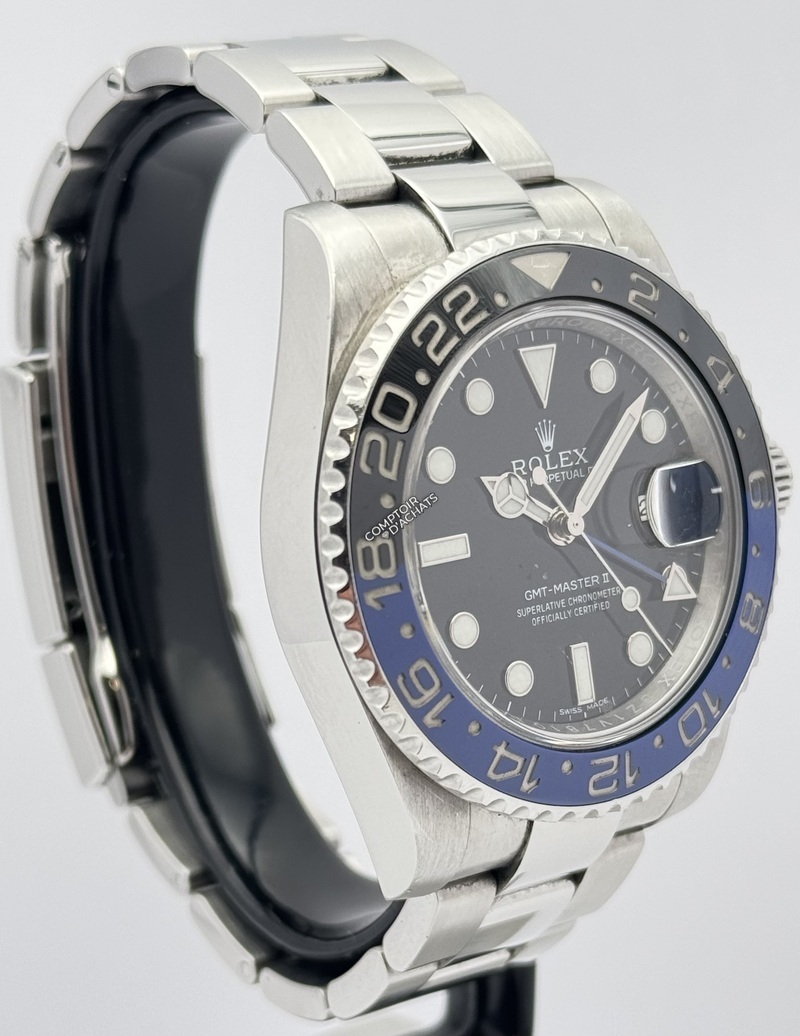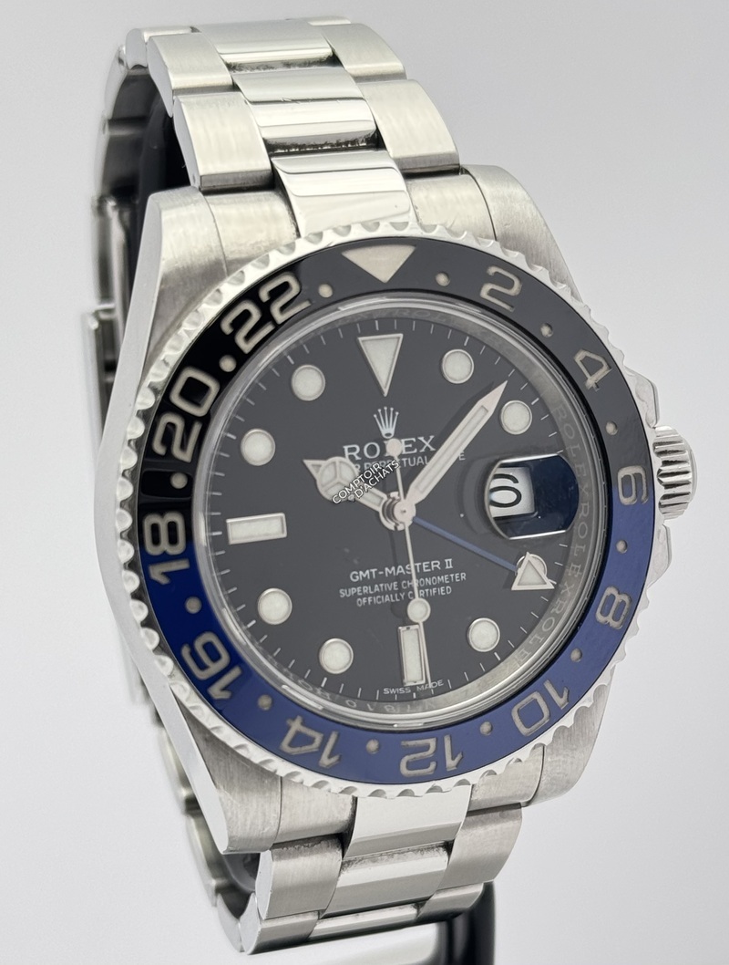 La Rolex GMT-Master II référence 116710BLNR, surnommée la "Batman", est un chronomètre de voyage moderne et très recherché.