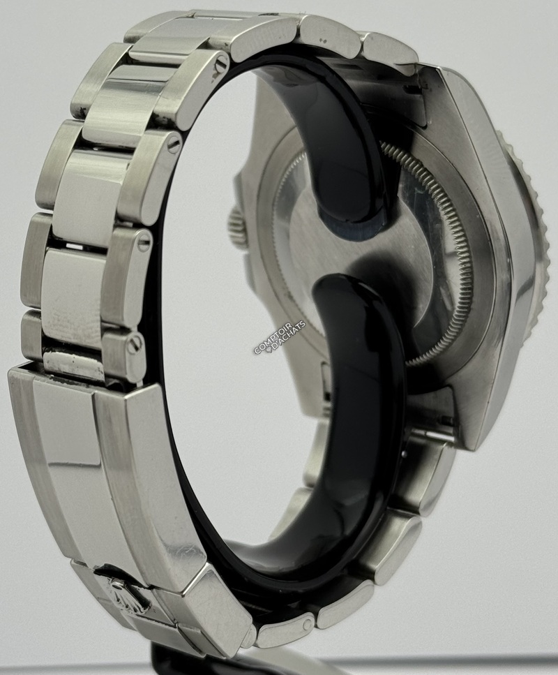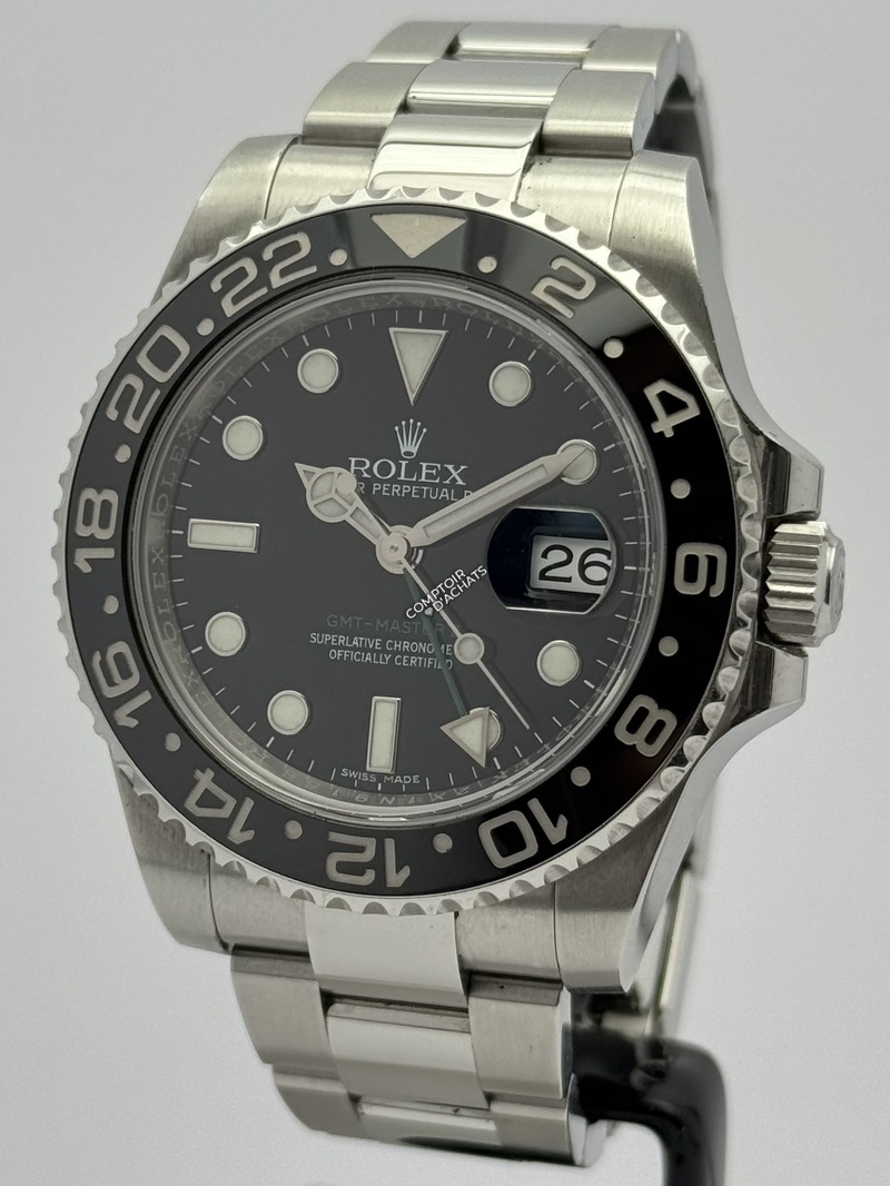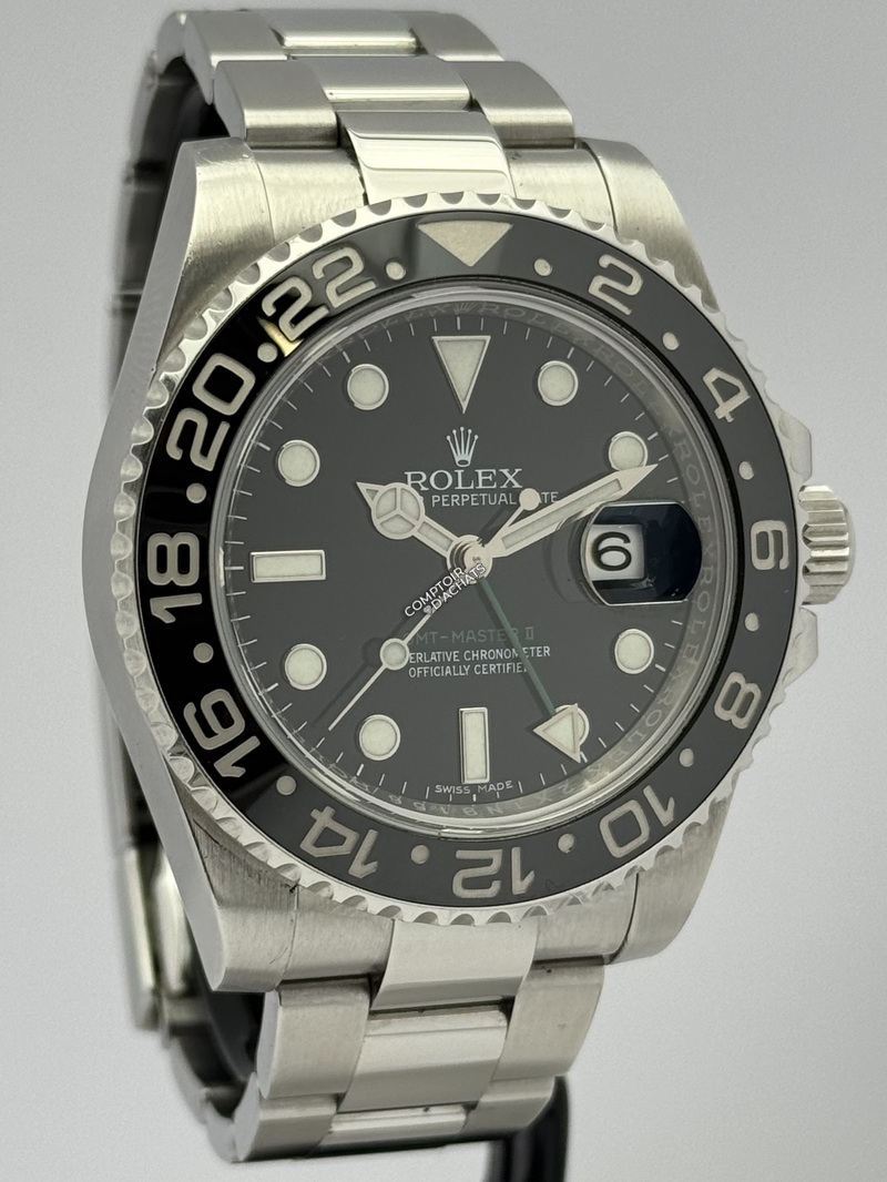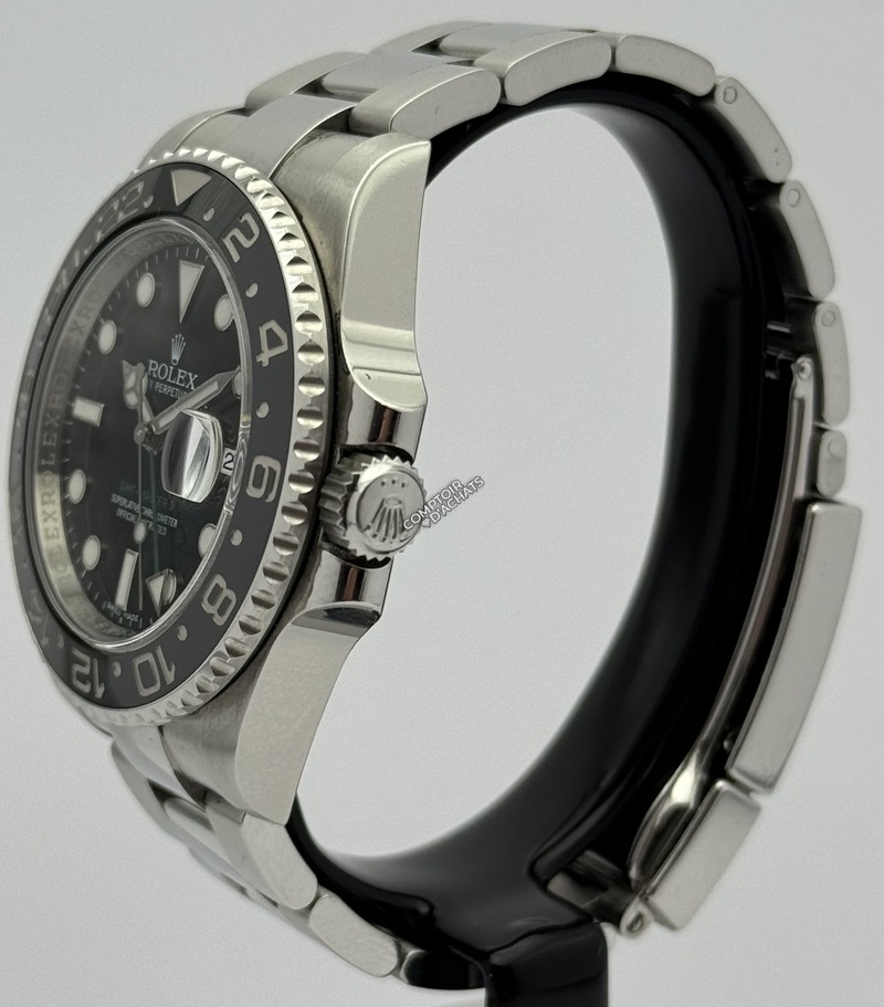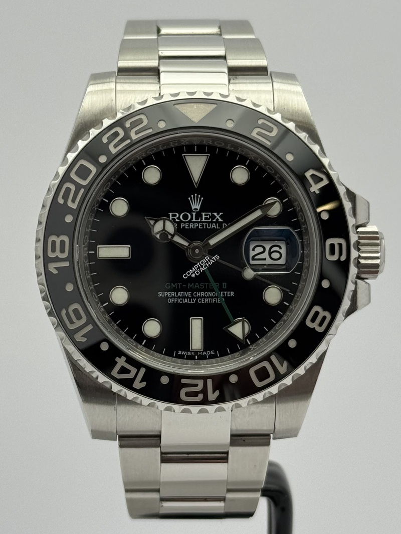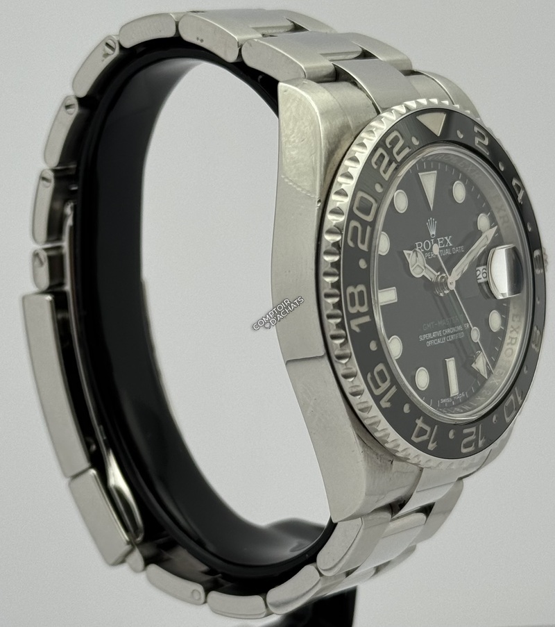 Lancée en 2007 et produite jusqu'en 2019, la référence 116710LN marque l'entrée de la GMT-Master II dans l'ère moderne de Rolex. Elle est particulièrement prisée pour être la dernière GMT-Master II dotée d'une lunette monochrome (noire) dans la collection acier.