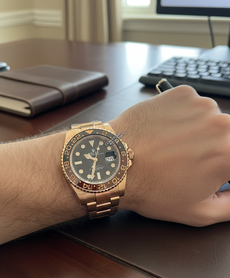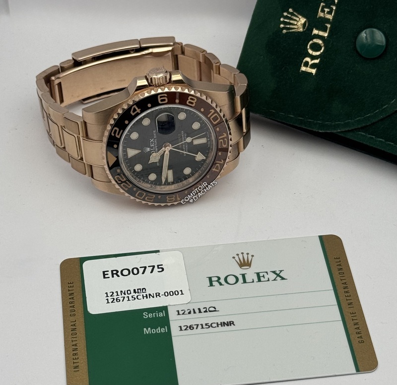 La Rolex GMT-Master II référence 126715CHNR, surnommée “Root Beer”, associe l’élégance de l’or Everose 18 ct à la fonctionnalité GMT emblématique. Elle se distingue par sa lunette Cerachrom bicolore brun et noir et son cadran noir avec affichage Chromalight.